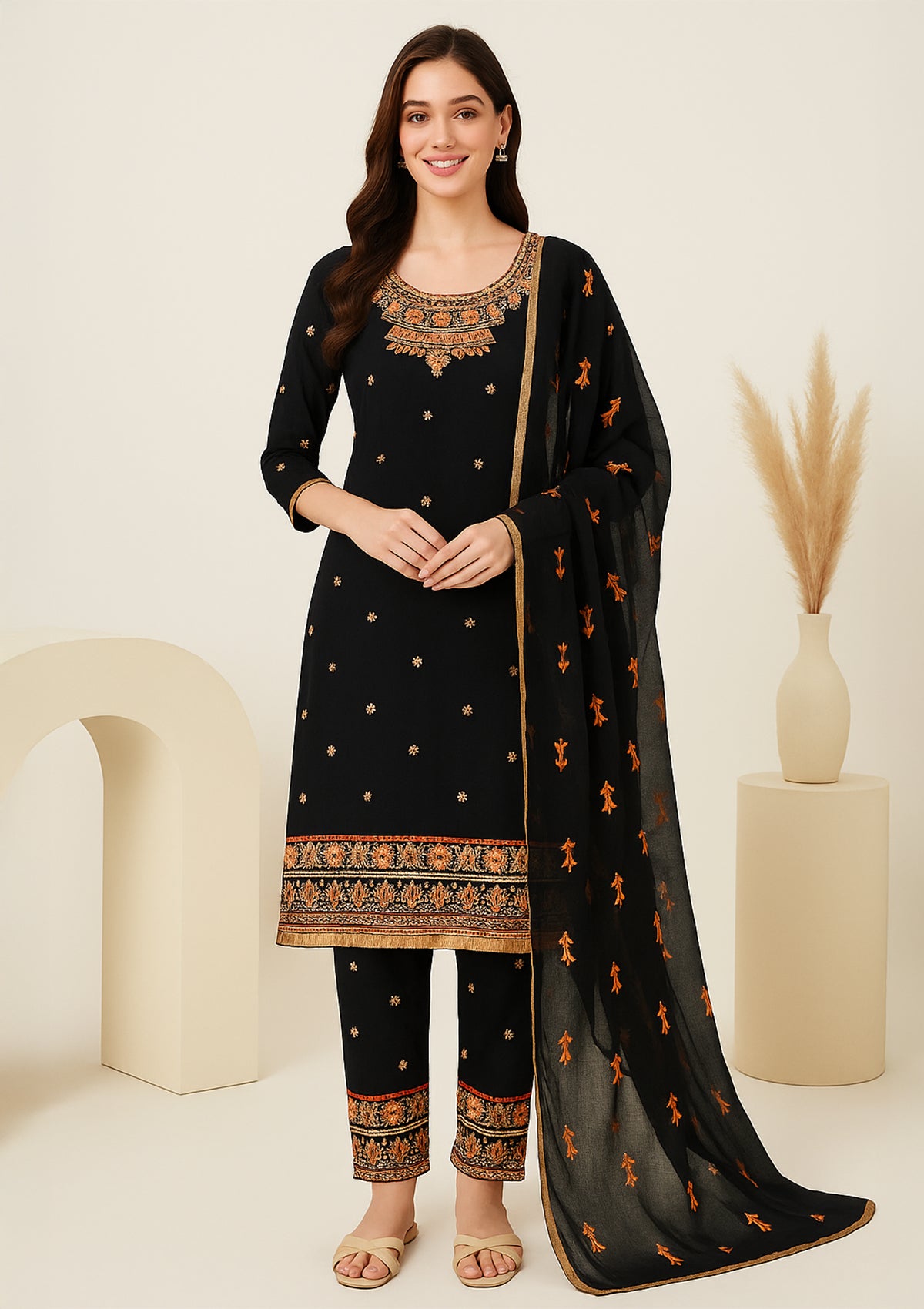 Upgrade your ethnic collection with this luxurious Black Jam Cotton Unstitched Suit featuring allover embroidery, zari detailing, and a beautifully designed zorjet dupatta. Perfect for festive occasions, weddings, parties, and family gatherings, this suit is crafted with premium jam cotton fabric for comfort and durability. The elegant embroidery on the neckline and borders adds richness, while the zorjet dupatta enhances its royal look.