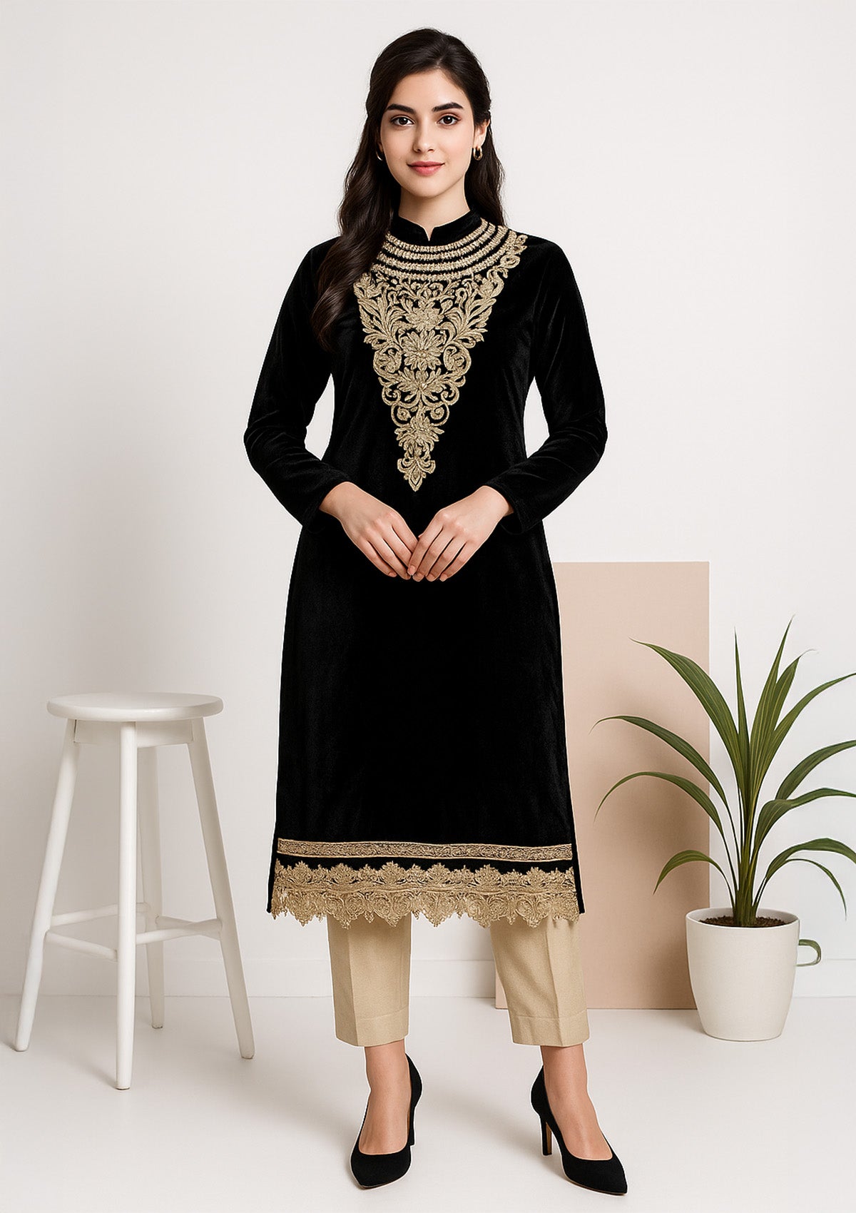 Opulent black velvet kurti featuring rich gold-toned zardozi floral embroidery cascading from the neckline and a luxe lace hem for a regal finish. Full sleeves carry contrast cuff accents while the front shows a delicate motif option with tasseled pendant for versatile styling. Soft velvet offers warm winter comfort and a premium drape—perfect for weddings, receptions, and festive evenings.