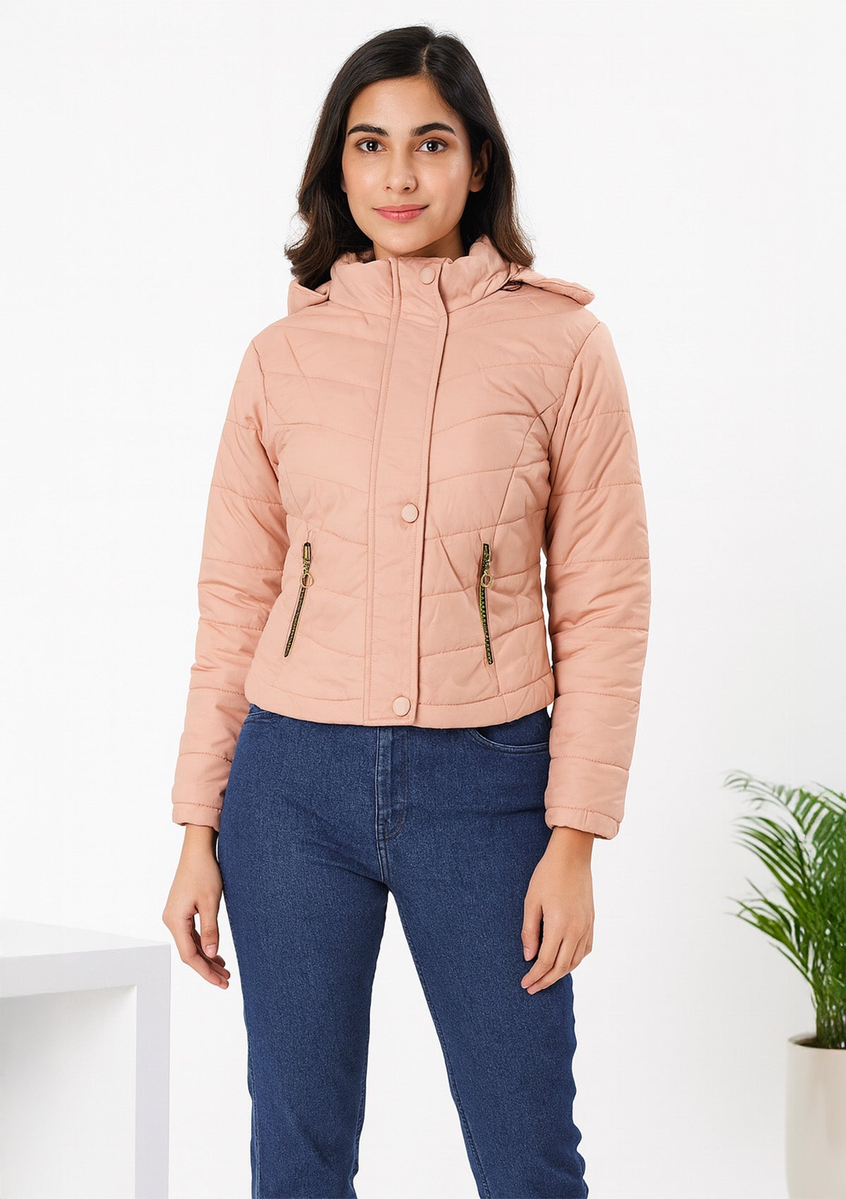 Blush Beige Quilted Hooded Jacket with Zip Pockets