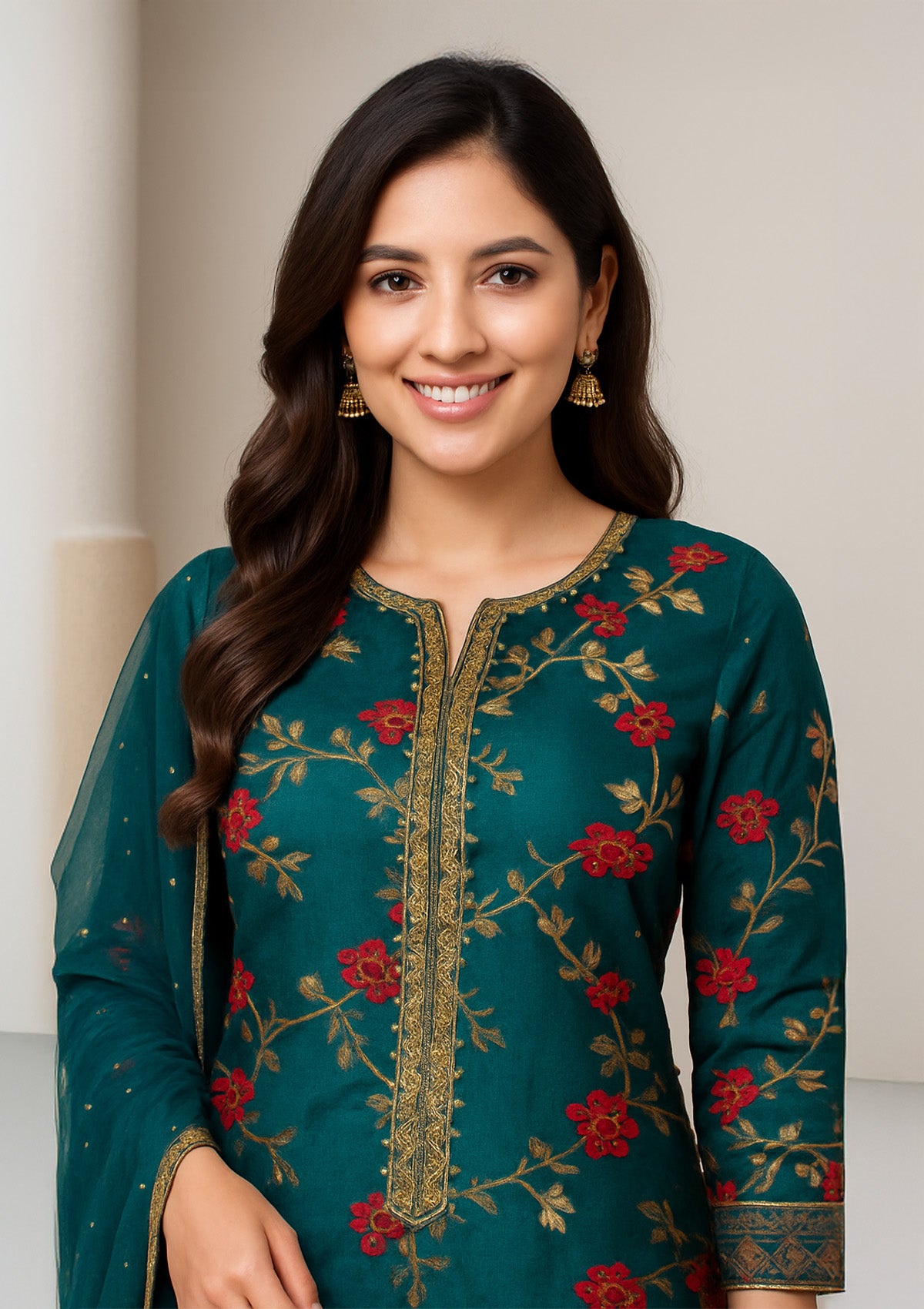 Enhance your ethnic style with this Bottle Green Silk Embroidered Unstitched Suit, crafted with elegance and premium quality. The rich embroidery with red and golden floral motifs makes it perfect for weddings, festive occasions, and party wear.