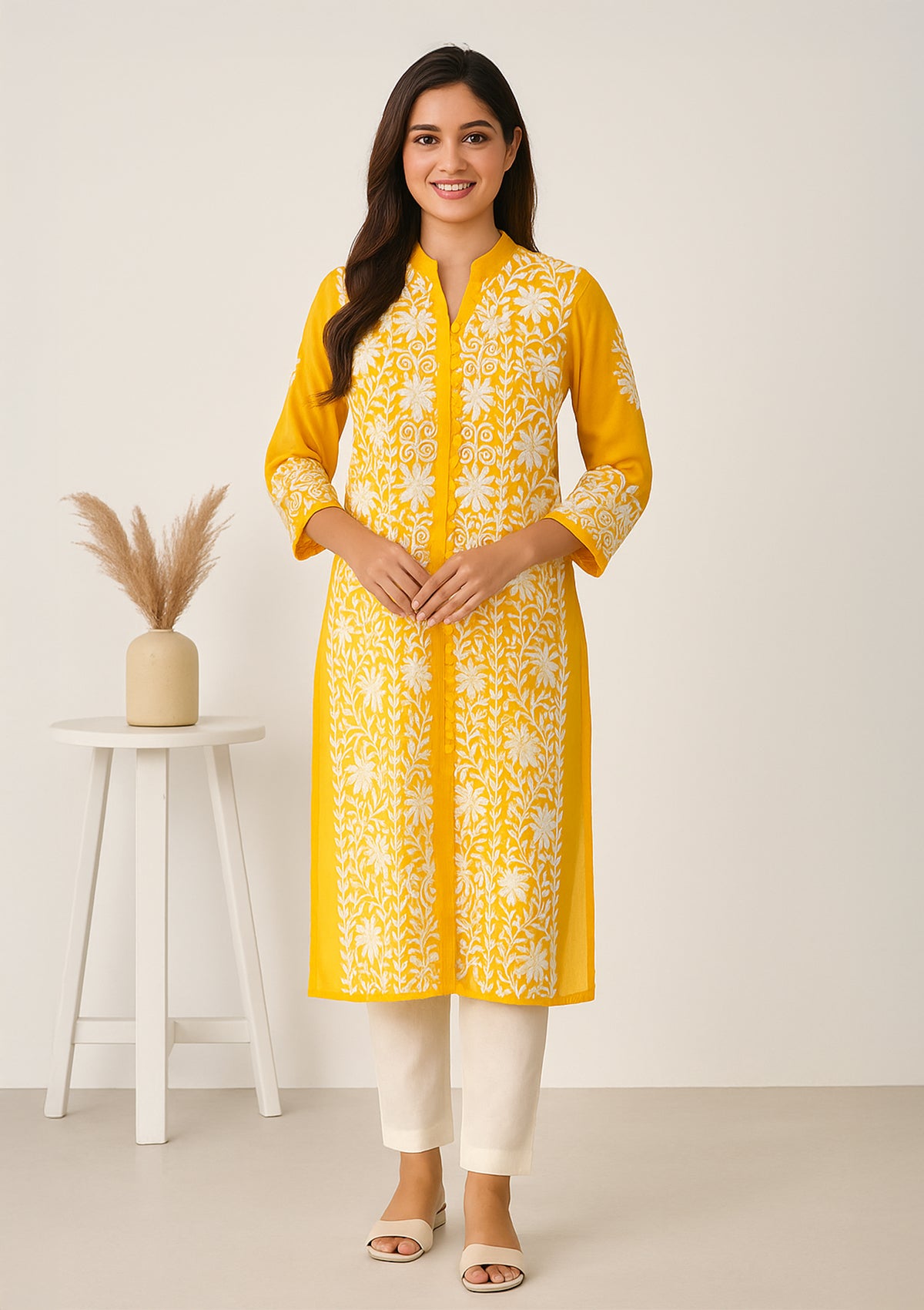 Radiate elegance with this vibrant Yellow Chikankari Kurta, intricately hand-embroidered on soft georgette fabric. The delicate floral motifs and buttoned placket in front add a touch of charm, while its straight silhouette ensures a graceful fall. Perfect for festive occasions, casual outings, or office wear — this kurta is a timeless piece that blends tradition with modern chic.