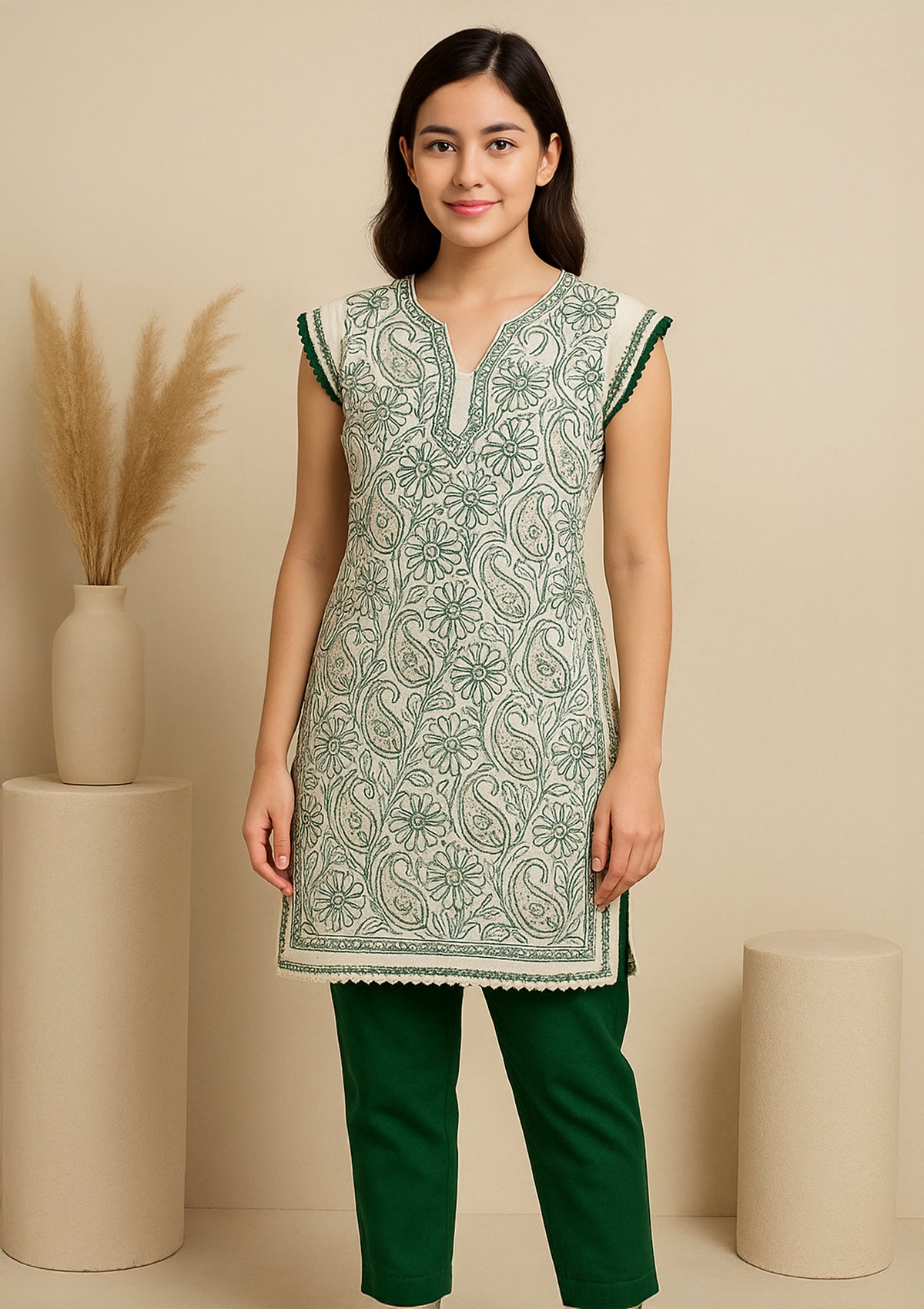 A refreshing twist to classic chikankari, this sleeveless short kurta in white is beautifully hand-embroidered with intricate green floral and paisley motifs. Paired with matching green pants, it strikes the perfect balance of comfort and elegance. Ideal for summer days, casual outings, or work wear, this set brings effortless charm and breathable ease.