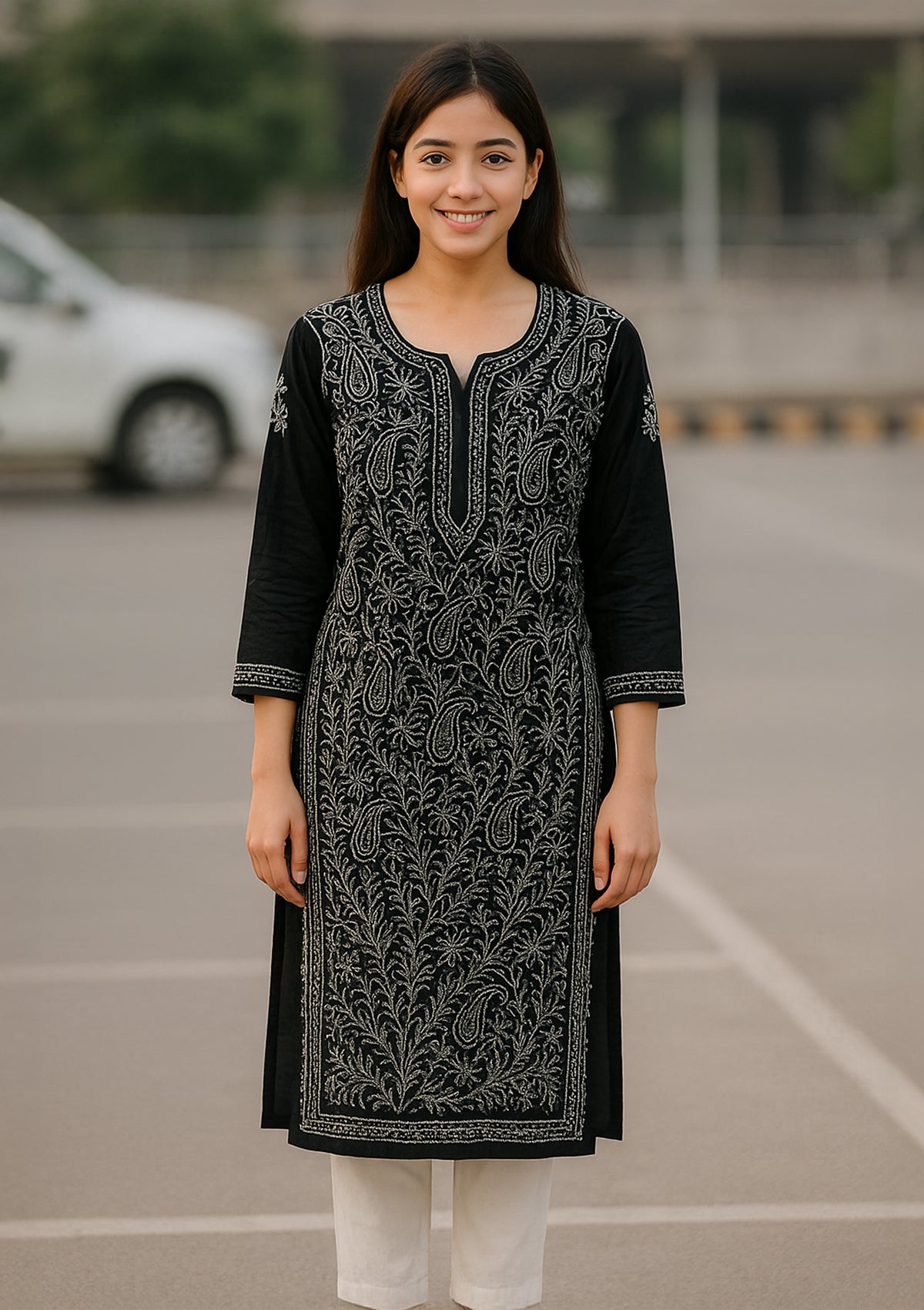 Chikankari Solid Women’s Long Kurta – Black