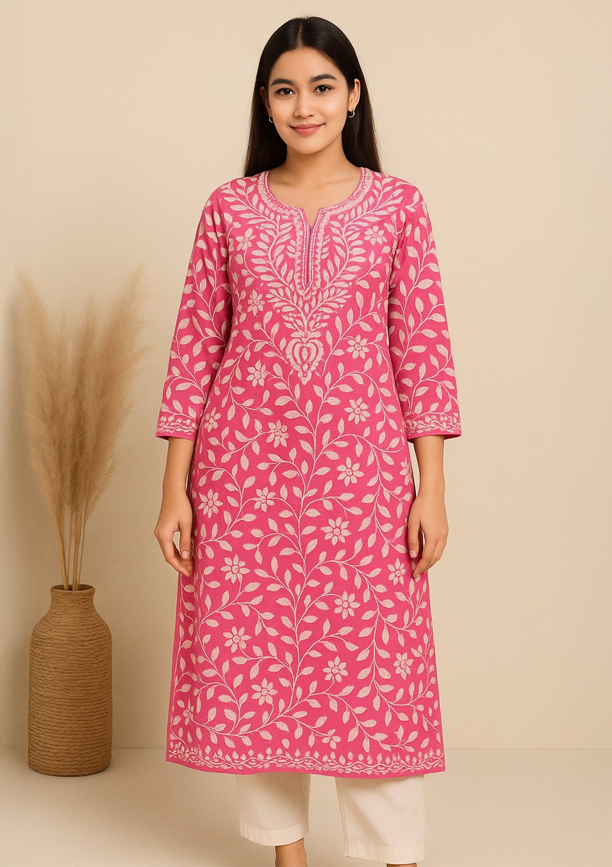 Chikankari Solid Women’s Long Kurta – Pink with White Embroidery