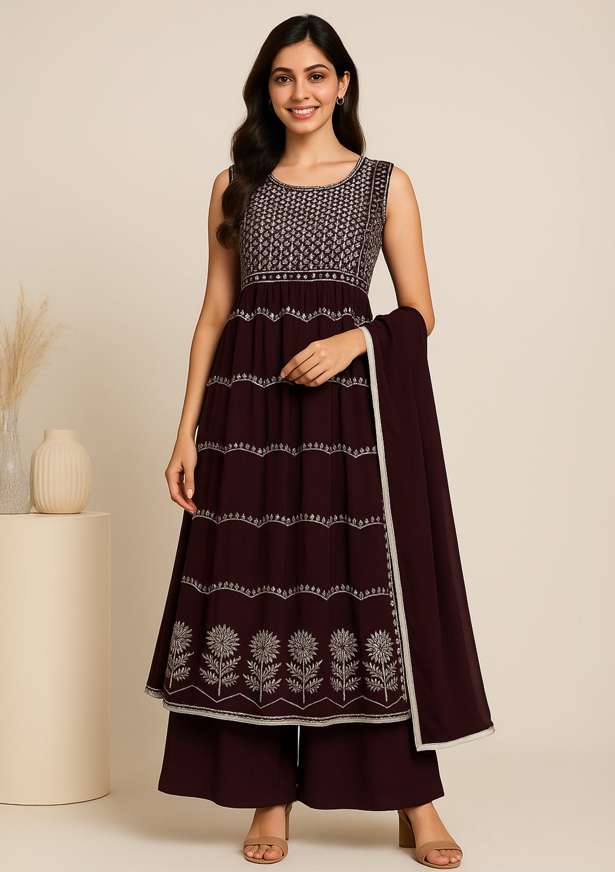 Elevate your ethnic style with this Dark Brown Georgette Naira Cut Suit, crafted for festive and party occasions. Designed with elegant embroidery and paired with a flowy dupatta, this outfit blends modern charm with traditional grace.