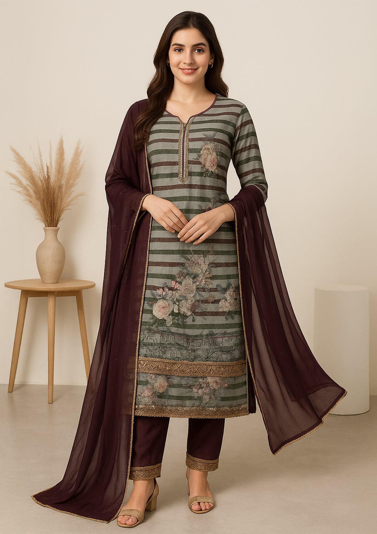Refresh your ethnic collection with this stylish Grey Muslin Unstitched Suit Set, featuring intricate floral embroidery and contemporary striped detailing. The premium muslin top, comfortable santoon bottom, and elegant brown chiffon dupatta combine to create a luxurious and versatile outfit for all special occasions. Perfect for festive gatherings, weddings, and parties, this unstitched dress material offers both comfort and trendsetting style along with custom tailoring for a flawless fit.