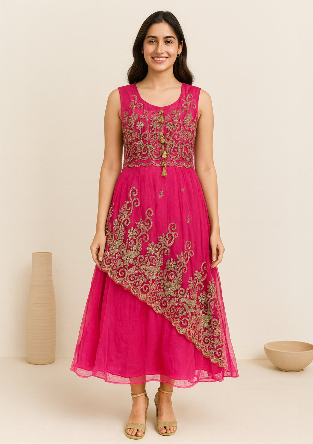 Turn heads with this gorgeous Pink Net Embroidered Dress, crafted with intricate golden floral embroidery and a unique asymmetrical layered design. Made with premium net fabric, this outfit is a perfect choice for weddings, festive functions, receptions, and parties.