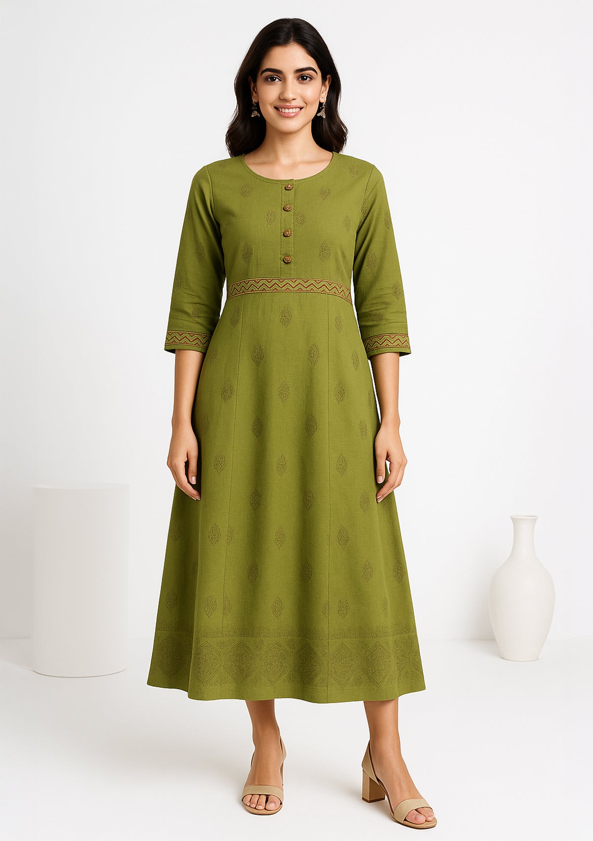 Upgrade your ethnic wardrobe with this green cotton gown designed for effortless elegance and all-day comfort. Perfect for casual outings, festive events, and office wear, this gown brings together traditional charm and modern minimalism.
