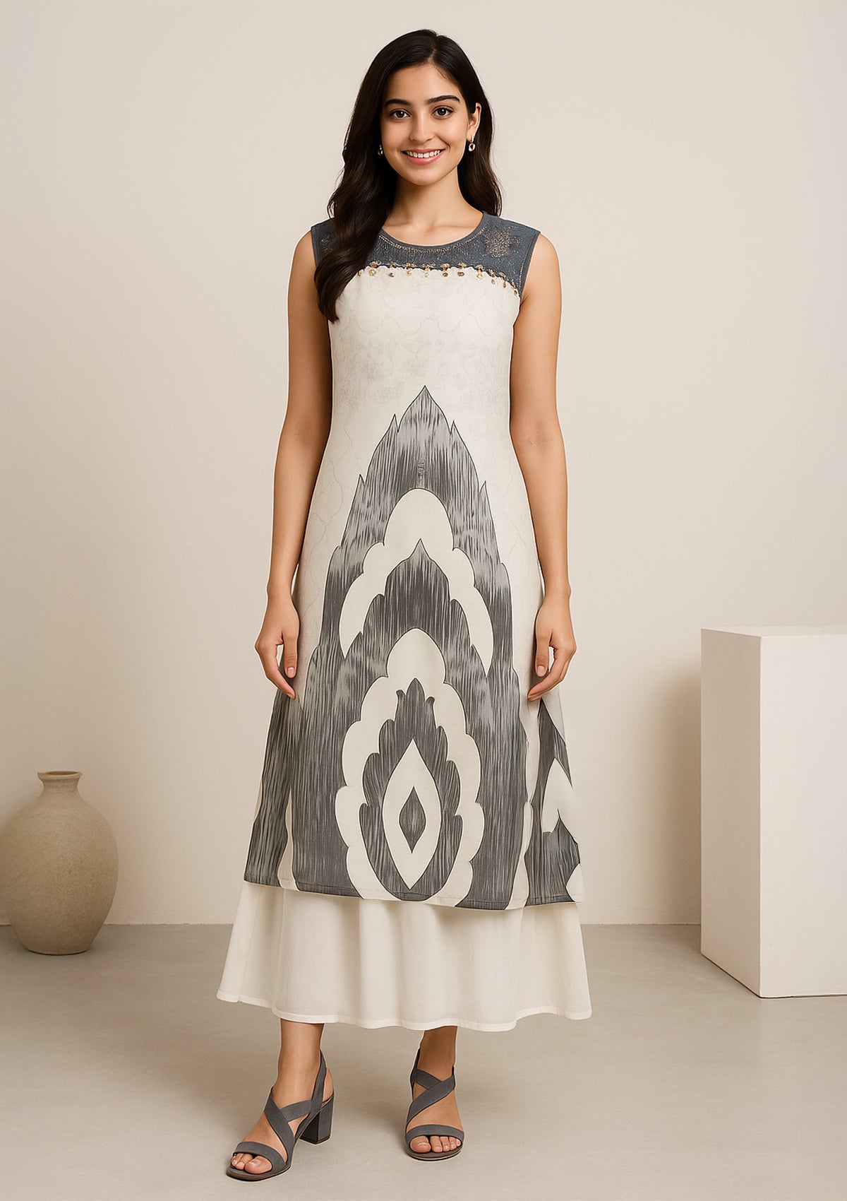 Add timeless grace to your wardrobe with this Elegant Off-White & Grey Printed Georgette Gown, designed in size 44 for a chic and comfortable fit. Made from premium georgette fabric, it offers a flowy silhouette with a lightweight feel. The sleeveless design and subtle neckline embellishments make it perfect for parties, festive occasions, and casual gatherings. The contemporary grey print on an off-white base adds a sophisticated contrast that suits both day and evening wear. Style it with minimal jewelry and heels for an effortlessly elegant look.