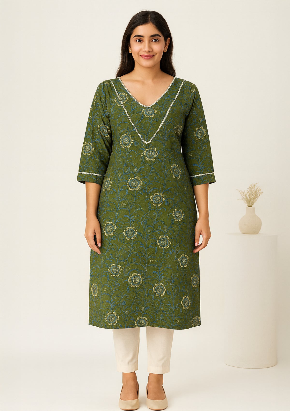 Step into effortless style with this green printed cotton kurti, designed for both comfort and elegance. Featuring an all-over floral print highlighted with subtle silver detailing along the neckline and sleeves, it strikes the perfect balance between minimal charm and festive flair. Made from breathable cotton, this kurti is ideal for daily wear, office dressing, or casual outings. Pair it with neutral trousers or leggings for a graceful ethnic look.