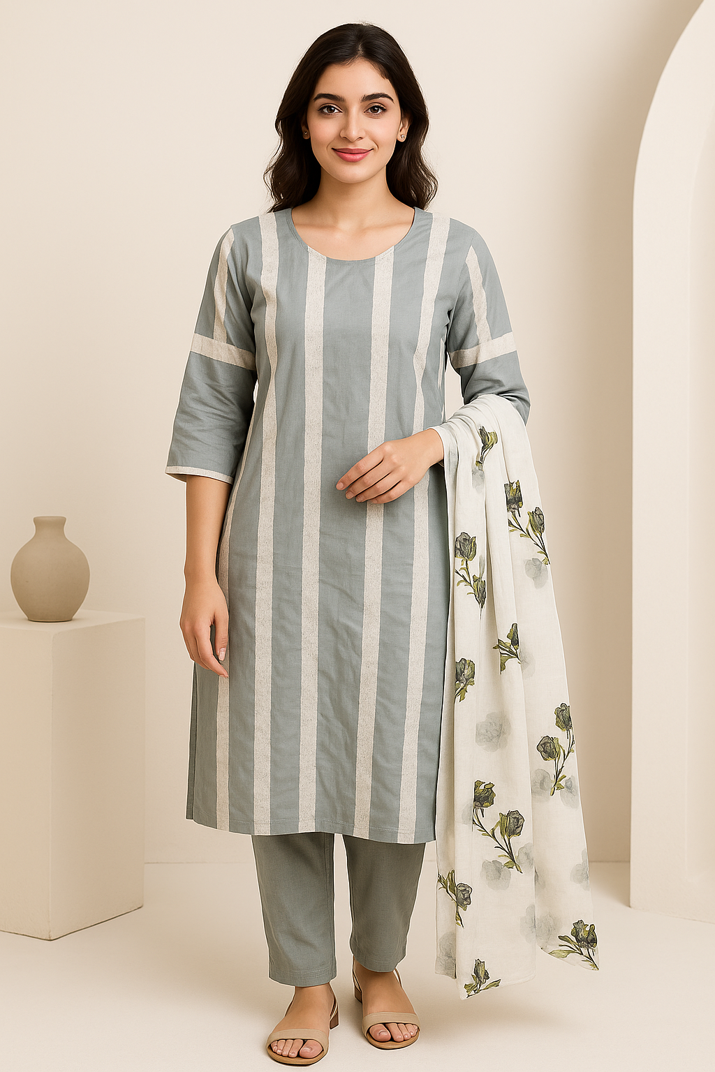 Grey and White Vertical Stripe Cotton Kurti with Floral Printed Dupatta
