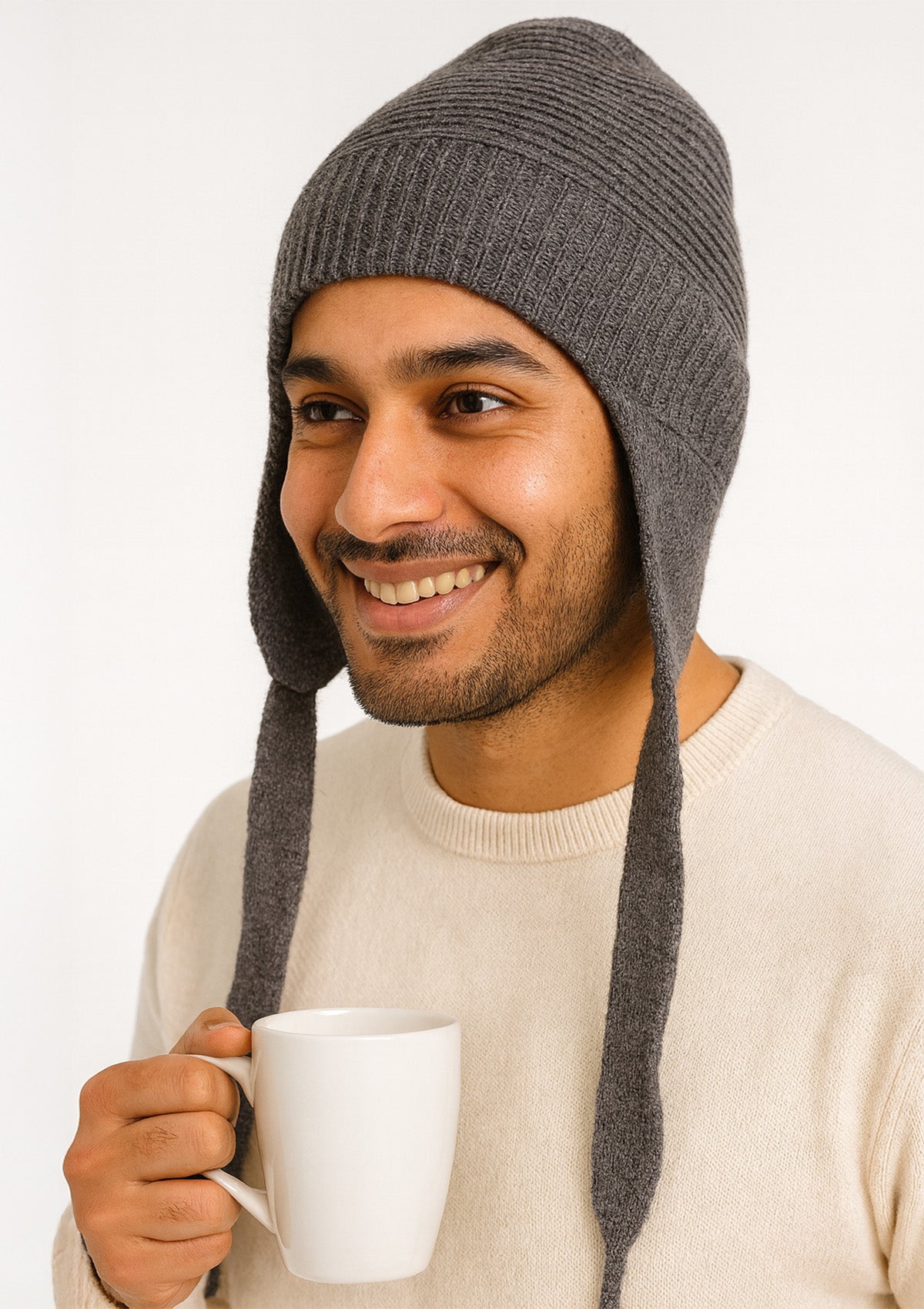 Grey women’s woolen ribbed knit winter cap with earflaps and ties