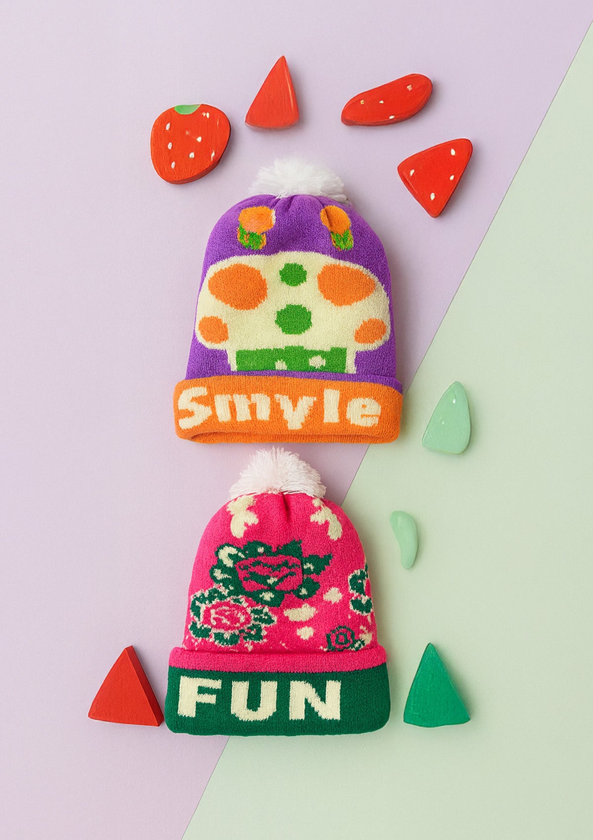 Fluffy pom poms and fun motifs make winter outfits more cheerful.
