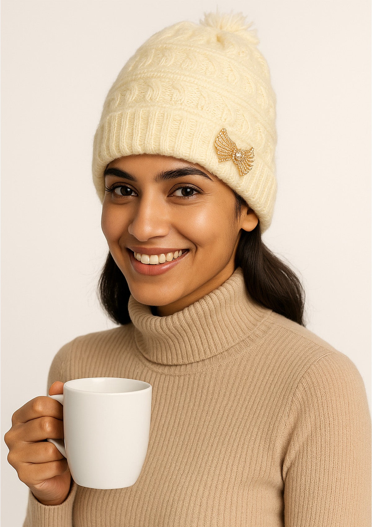 Elevate winter fashion with this elegant cream woolen fur cap, crafted from ultra-soft, thick knit for unparalleled comfort and warmth in chilly seasons. The classic beanie design features a plush pom-pom on top and is highlighted by a statement pearl-studded brooch at the fold, blending traditional warmth with modern sophistication. With a flexible, stretchable fit suitable for most head sizes, this cap provides excellent insulation from cold winds while ensuring breathability and gentle touch against the skin. Lightweight, easy to pack, and machine-washable, it is ideal for travel, outdoor adventures, or everyday casual style. This cream woolen cap perfectly complements coats, jackets, shawls, and makes a thoughtful winter gift.