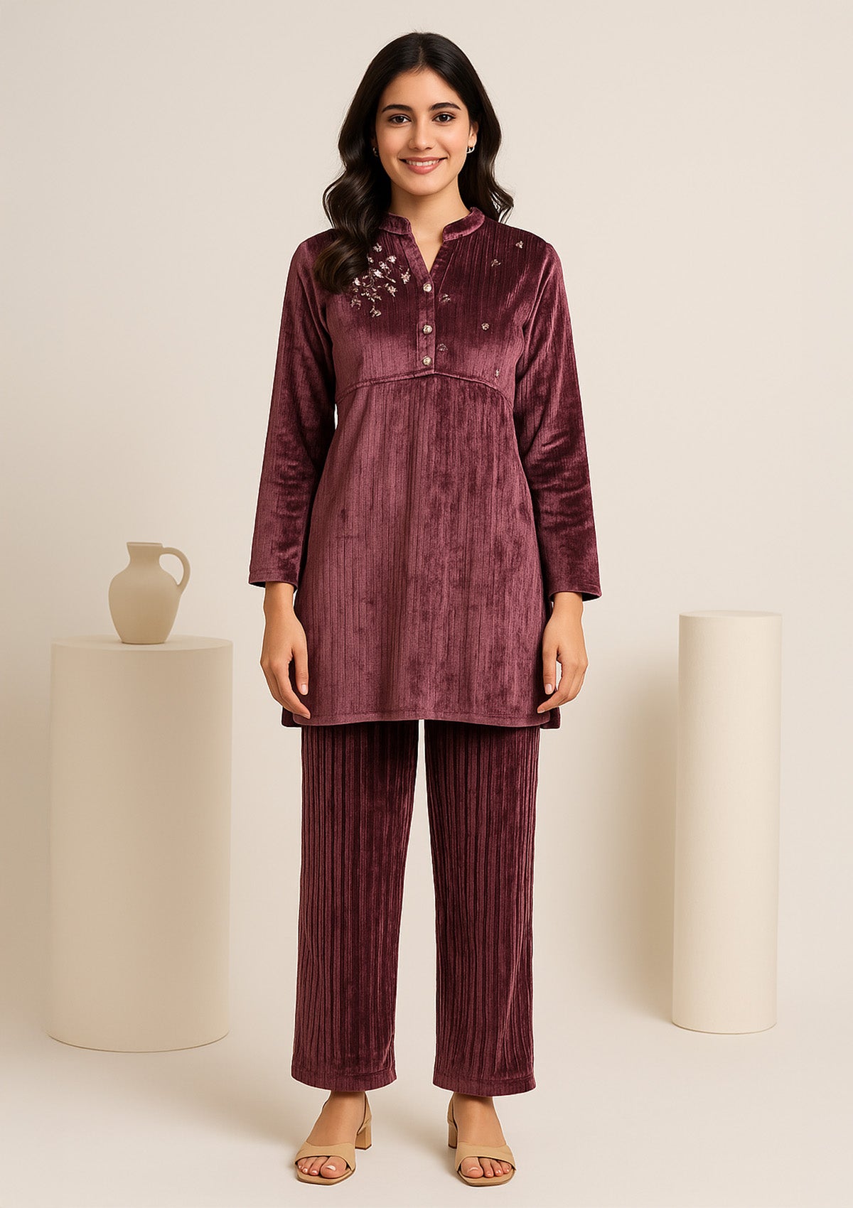 Stay cozy yet glamorous with this Velvet Cord Set in Deep Wine, designed for elegance and comfort. Perfect for winter evenings and festive occasions, this cord set combines soft velvet fabric with intricate embroidery on the yoke, making it both stylish and warm.