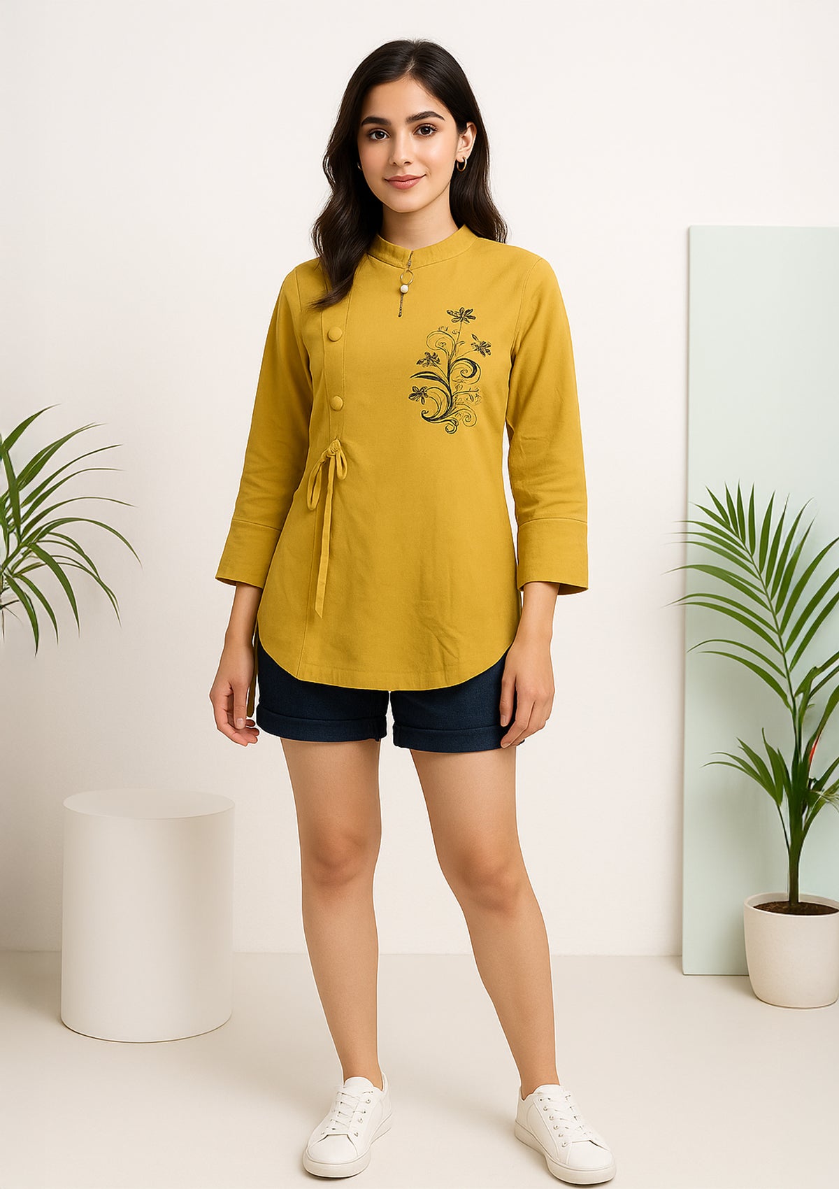 Stand out in comfort and style with this mustard yellow spandex stretchable top, designed with a unique asymmetric button placket and chic tie-belt on the side. Crafted from breathable, flexible spandex for a flawless fit, it’s adorned with elegant black floral embroidery for a modern look. Full sleeves, high round neck, and statement details make it the perfect pick for work, travel, or everyday wear.