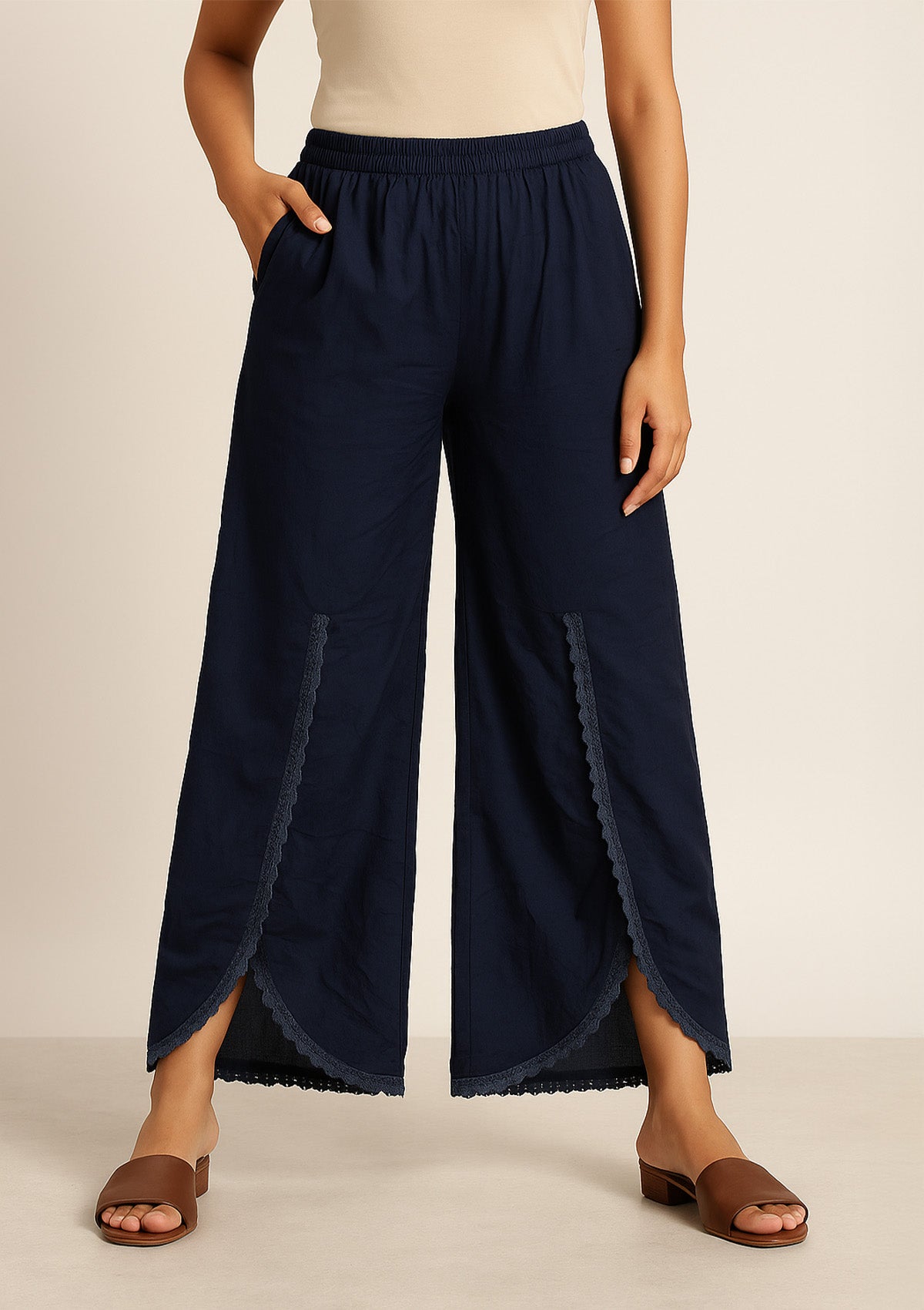 Step out in comfort and elegance with these Women’s Navy Blue Rayon Lace Palazzo Pants, crafted from breathable premium rayon for a soft, lightweight feel all day long. The stylish wide leg design is beautifully accented with matching navy lace along the scalloped edges, offering a touch of sophistication and a contemporary flair. Perfect for casual, festive, college, and ethnic wear, these plazzo pants pair effortlessly with kurtis, tops, or tunics for versatile year-round looks. An elastic waistband ensures a flexible, flattering fit for all body types, while the solid navy shade enhances both traditional and modern outfits.