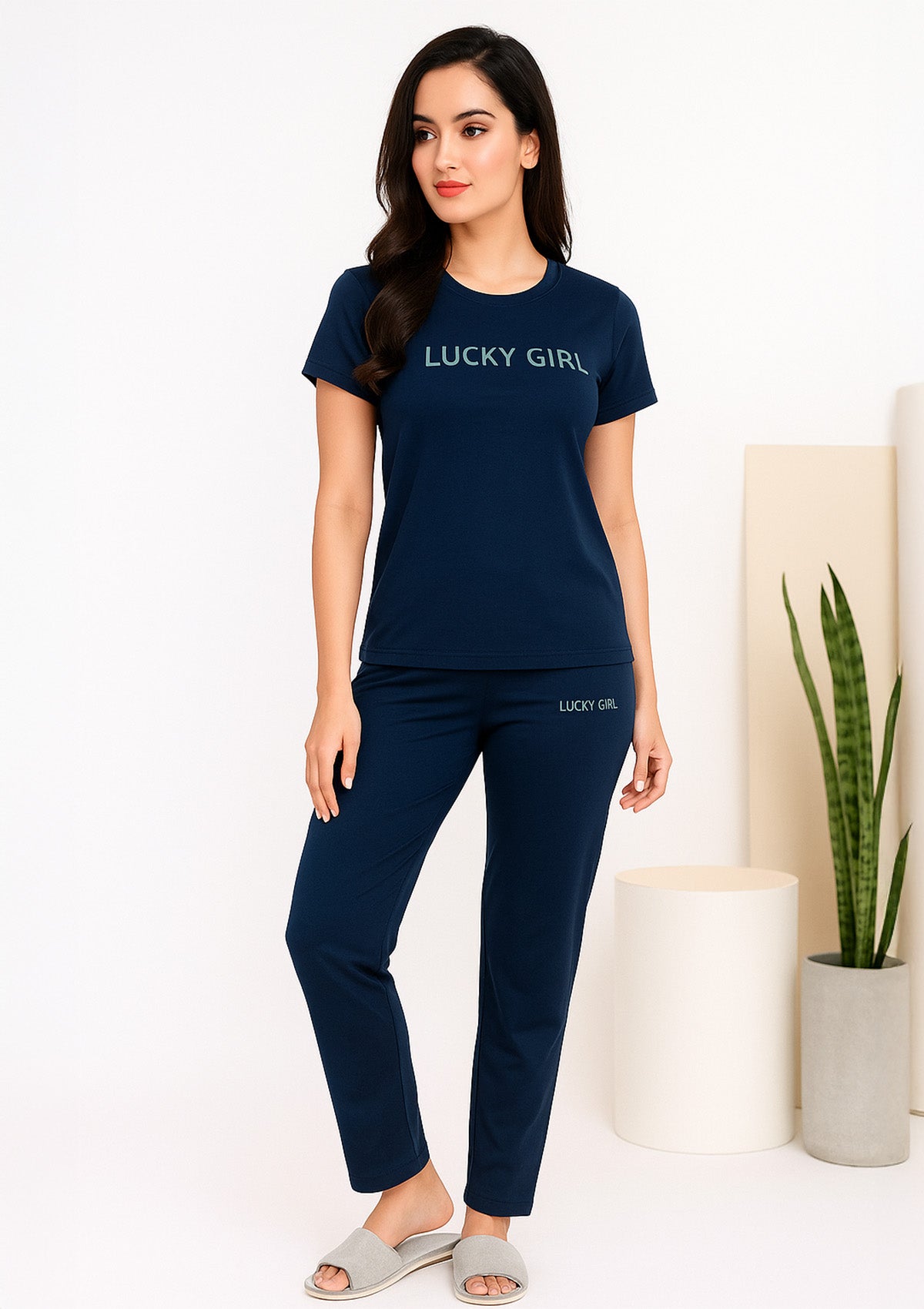 Streamline your lounge routine with a navy co‑ord featuring a soft knit crew neck tee and matching straight fit bottoms, finished with a minimal “Lucky Girl” graphic for a clean, modern look at home. The breathable fabric and elasticated waistband deliver easy movement from relaxed evenings to slow mornings, while the lightweight, easy‑care construction supports frequent wear across seasons. A monochrome palette, smooth hand‑feel, and tidy hems make this set photogenic and dependable for lounging, sleep, and casual errands.
