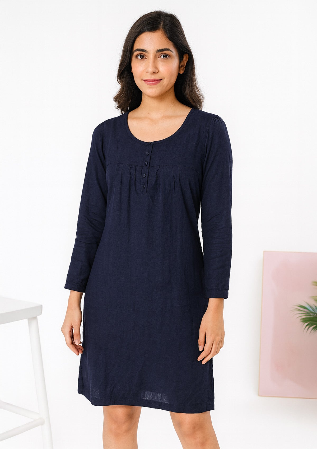 Effortlessly stylish navy woolen one piece midi dress crafted from a soft, warm knit that drapes comfortably for all‑day wear. Features a round neck, button front placket, and fitted sleeves for a polished winter look. Perfect for office, college, or casual outings—layer with boots or a long coat for chic seasonal flair.