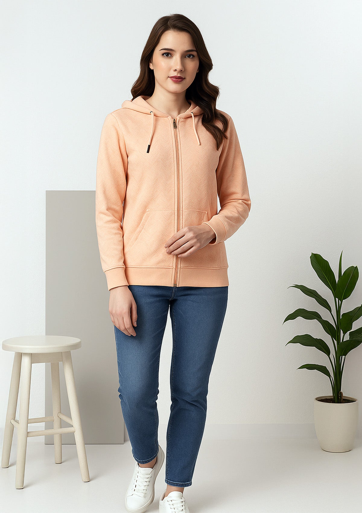 Elevate everyday comfort with this premium fleece zip hoodie featuring a soft brushed interior, a subtle allover geometric texture, and a smooth front zipper. The drawstring hood and ribbed cuffs and hem provide a snug fit, making it a versatile peach layer for errands, travel, and lounging.