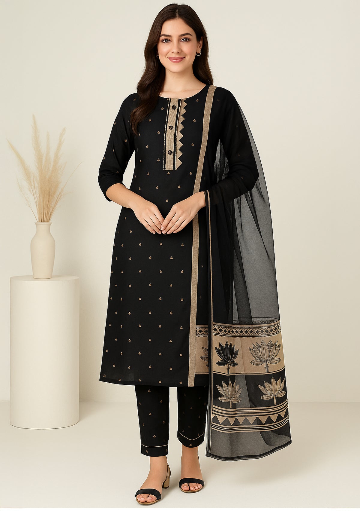 🔹 Design: Elegant black shade with golden embroidery & minimal motifs