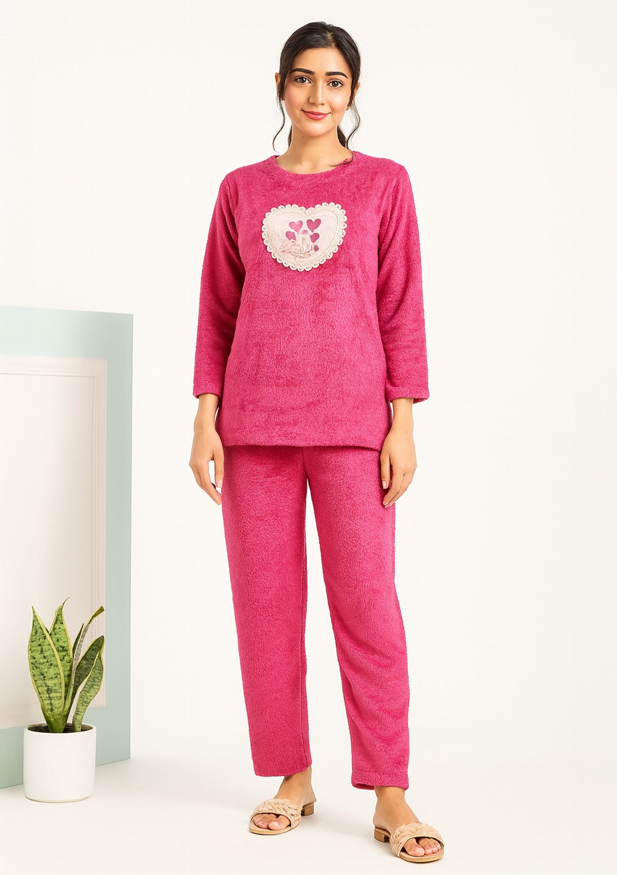 Slide into snuggly comfort with this premium co‑ord night suit featuring a plush fleece long‑sleeve top adorned with a cute heart appliqué and matching straight pants for relaxed, all‑night ease. The breathable, gentle‑on‑skin fabric keeps you warm without weight, making it ideal for lounging, bedtime, and lazy weekend mornings.