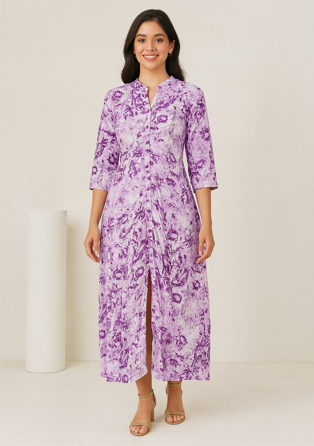 Discover elegance with our Purple Tie-Dye Rayon Long One Piece. Designed with a mandarin collar, button-down front, and trendy front slit, this blends comfort with style. The soft rayon fabric ensures breathability, making it perfect for casual wear, office looks, or festive outings. The purple and white tie-dye pattern gives it a chic and youthful vibe.