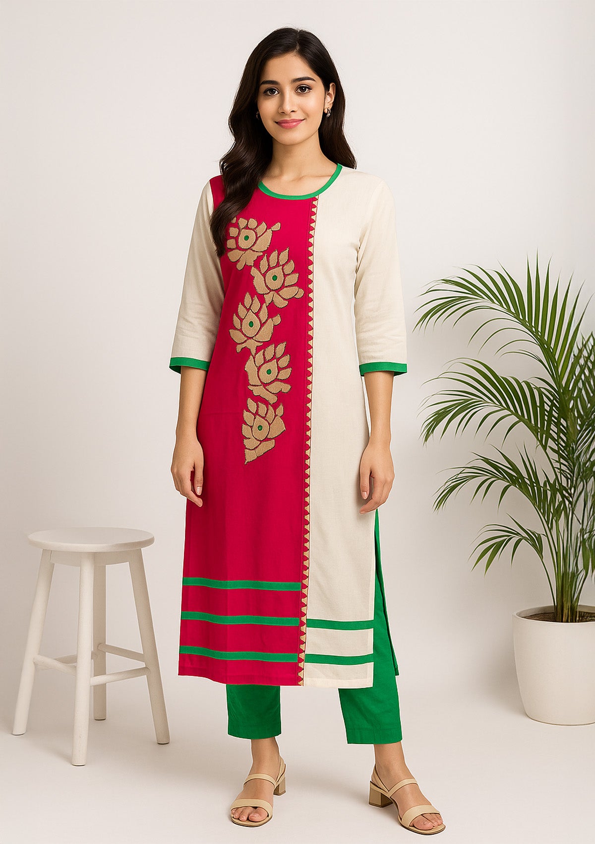 Uplift daily style with this rayon straight kurti featuring a crisp cream and deep magenta color block design, highlighted by stunning gold-toned lotus embroidery. Accented with green piping and geometric borders for a chic fusion vibe, this kurti boasts a soft, flowy rayon fabric for unmatched comfort in every season. Whether for casual outings, work, or festive occasions, this piece brings together traditional artistry with modern simplicity for a fresh, standout look.