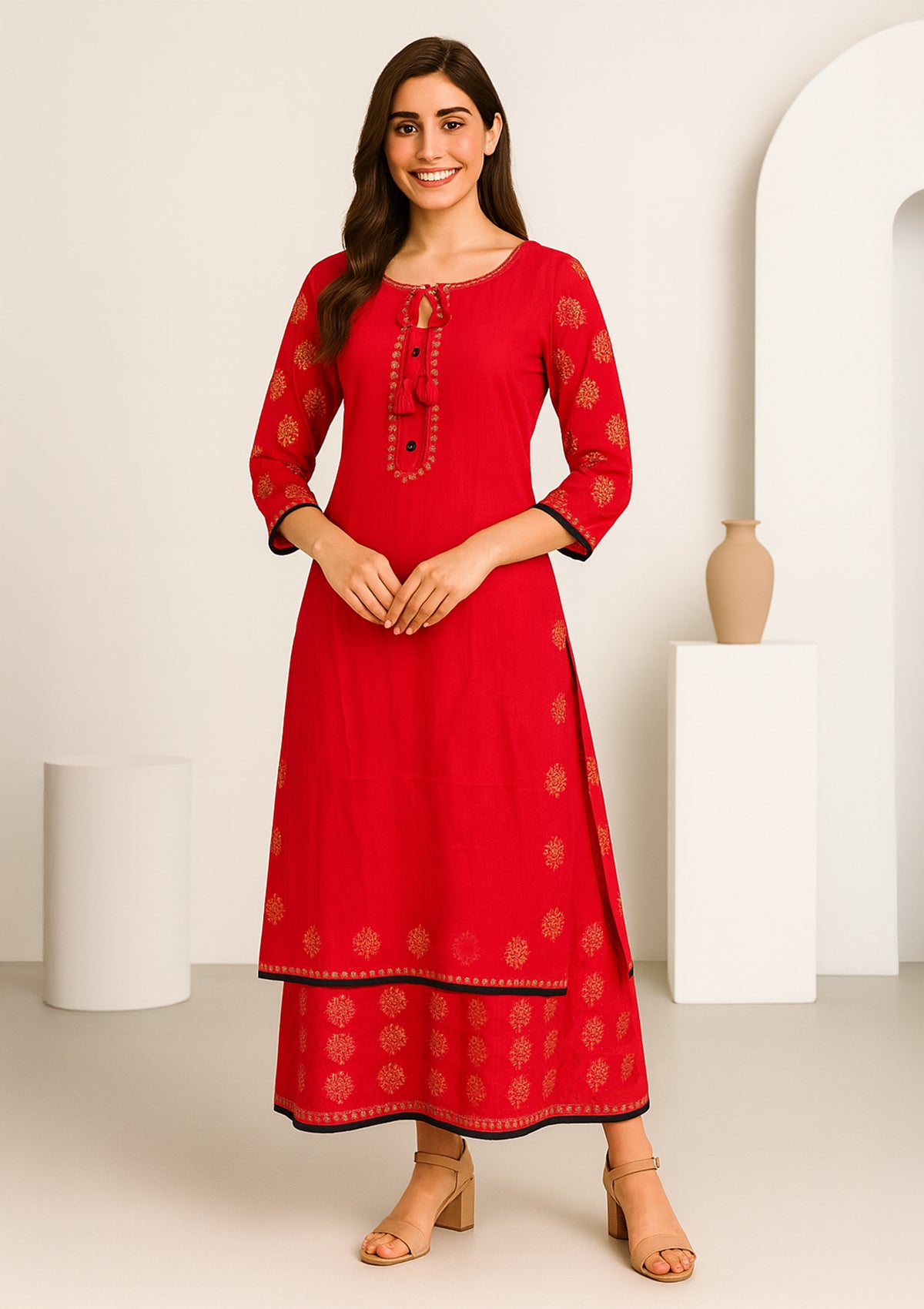 Red Rayon Dual-Layered Gown with Over-Jacket Style