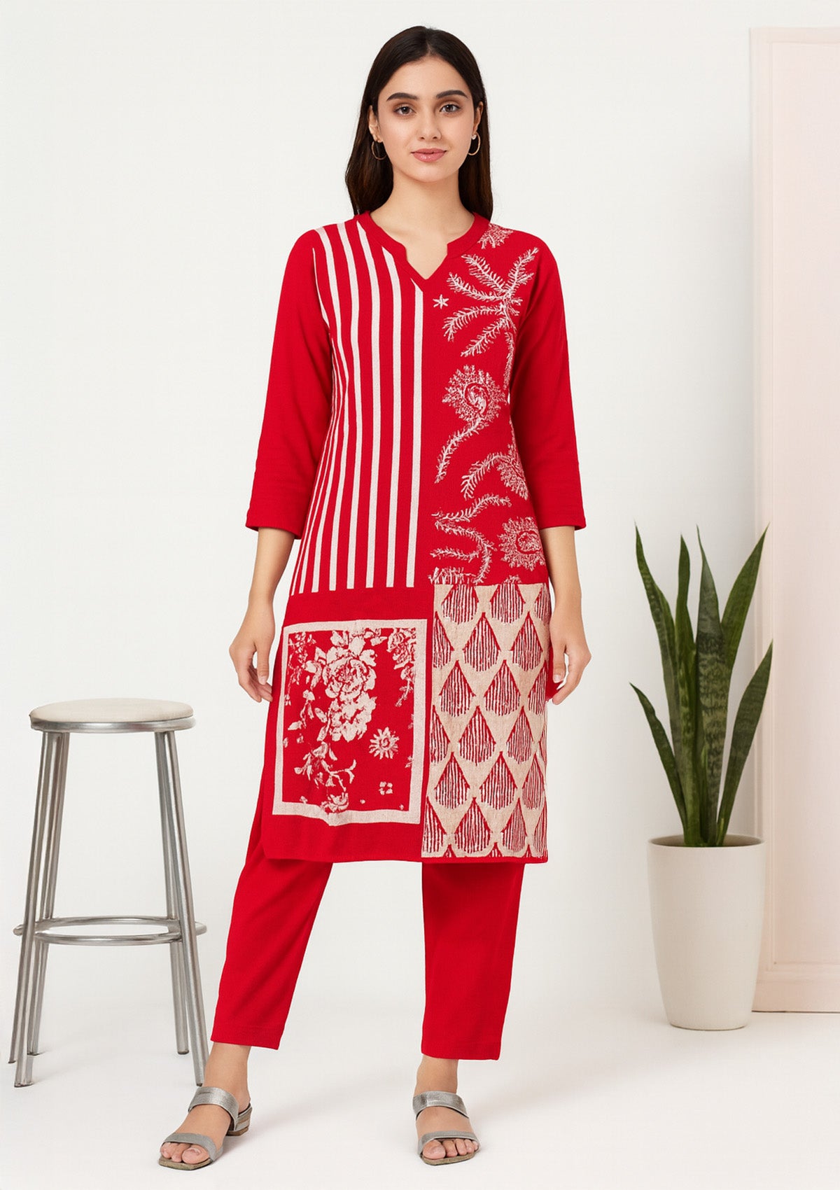 Red Woolen Kurti – Patchwork Design with Stripes