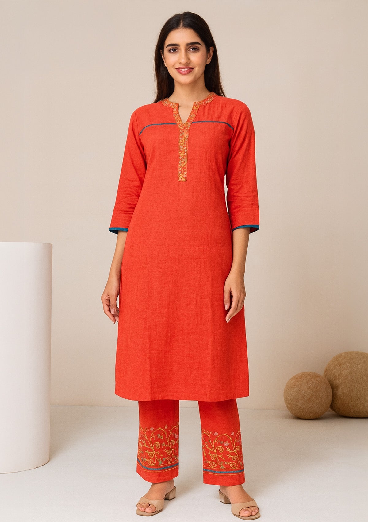 This stunning Reyon straight kurta set in a vibrant red shade is perfect for both daily wear and festive occasions. The kurta features subtle embroidery work on the neckline and sleeves, paired with beautifully designed printed palazzo pants that add a touch of ethnic charm. Made with soft and breathable Reyon fabric, this outfit ensures all-day comfort with style. Its graceful cut and easy flow make it suitable for office wear, casual gatherings, or small festive celebrations.
