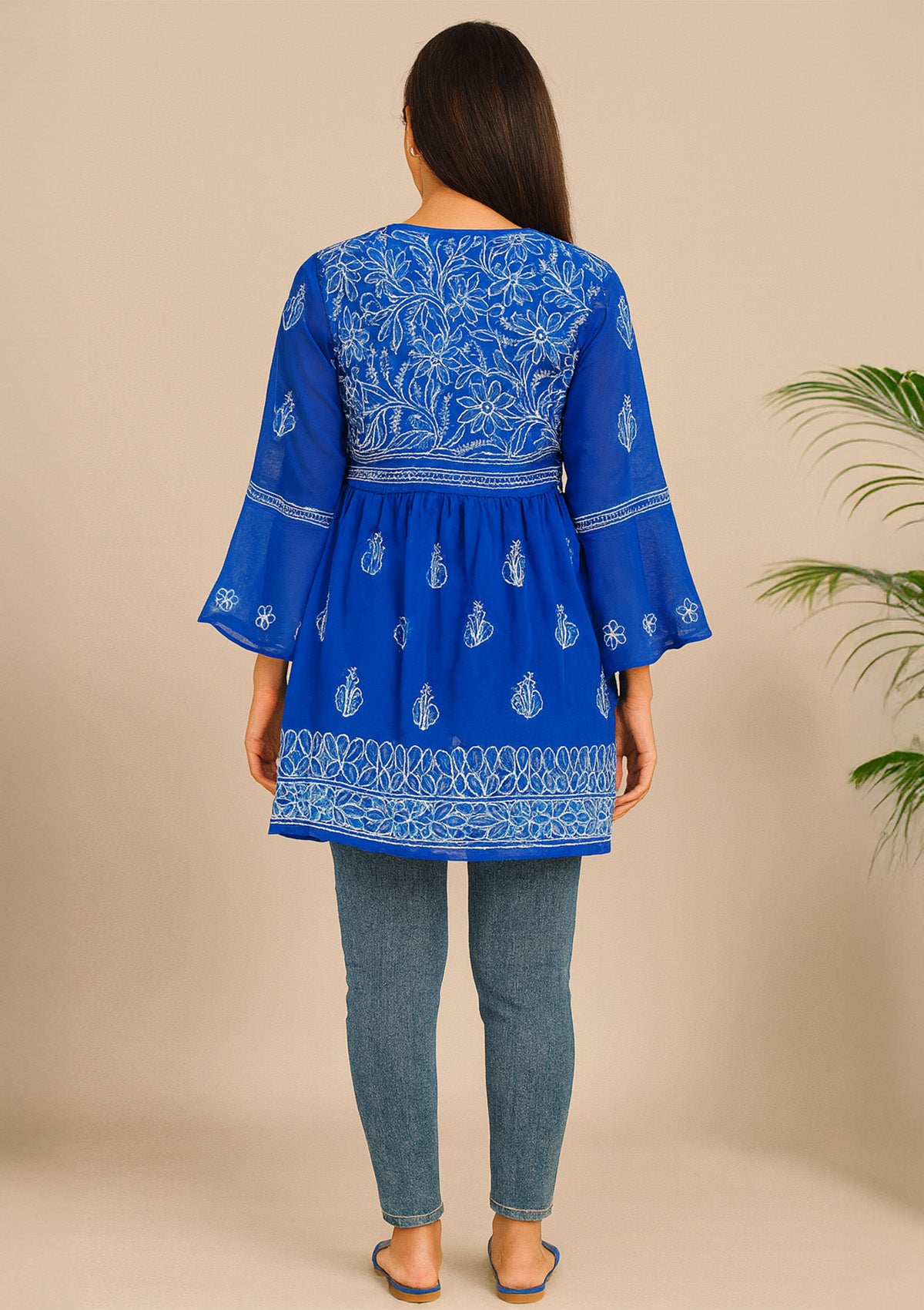 Step into elegance with this royal blue frock-style net kurti, beautifully detailed with intricate white embroidery. The yoke showcases geometric and floral threadwork, while the flared frock-style silhouette gives it a flowy, youthful charm. Bell sleeves with embroidered cuffs and all-over motifs add to its festive appeal. Crafted from lightweight transparent net fabric, this kurti is airy and graceful, perfect for layering with a slip. Ideal for festive occasions, parties, or casual evening outings, it blends traditional embroidery with a trendy frock-inspired design.