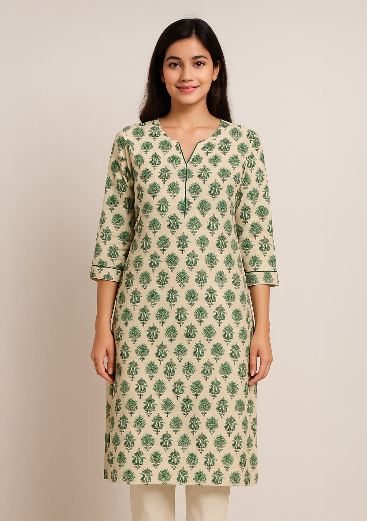 Beige & Green Cotton Printed Kurti – Elegant Everyday Wear