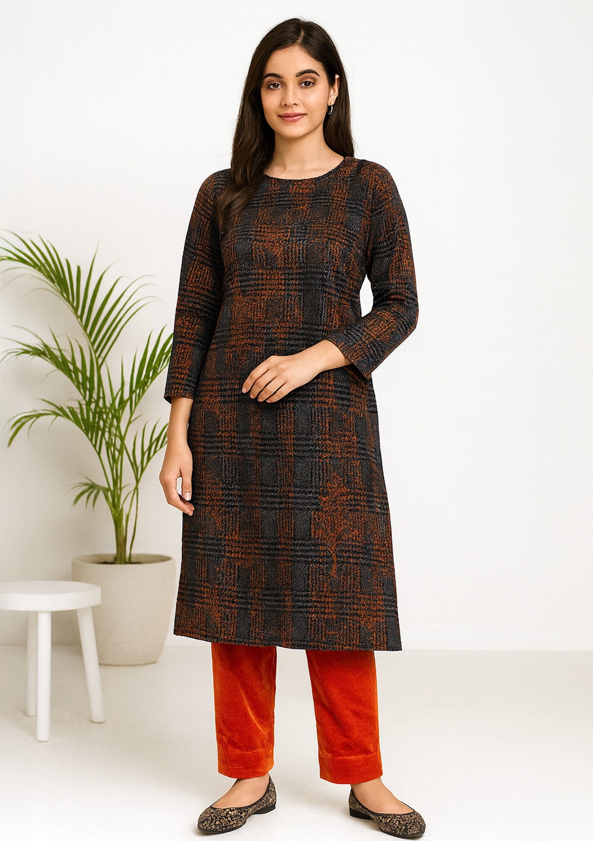 Build a standout winter outfit with this unstitched velvet suit set featuring a rich burnt orange velvet bottom and a coordinating plaid jacquard kurti fabric in black, grey, and rust. The plush velvet adds luxe warmth while the patterned top fabric offers structure and visual interest for custom straight or A-line silhouettes. Tailor a unique, cozy ensemble for parties, dinners, or festive gatherings.