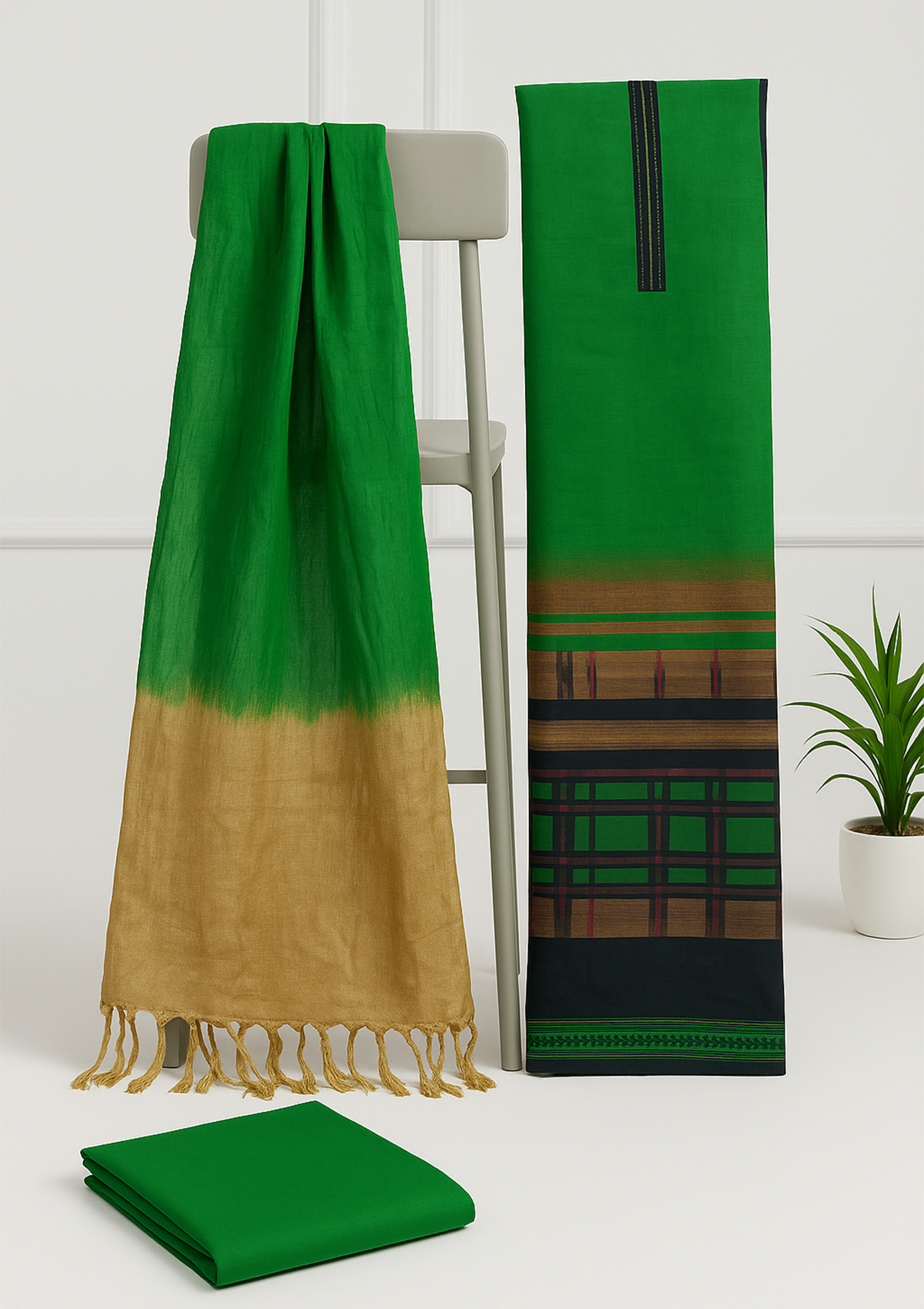 Refresh winter style with this unstitched suit set featuring an emerald green kurti piece with checkered border accents, a matching plain green bottom, and an ombre tassel dupatta in green and gold. The soft, warm fabric tailors easily into straight or A-line silhouettes, while the coordinated patterns and dip-dye stole add a chic seasonal touch. Ideal for everyday wear, office looks, and casual gatherings.