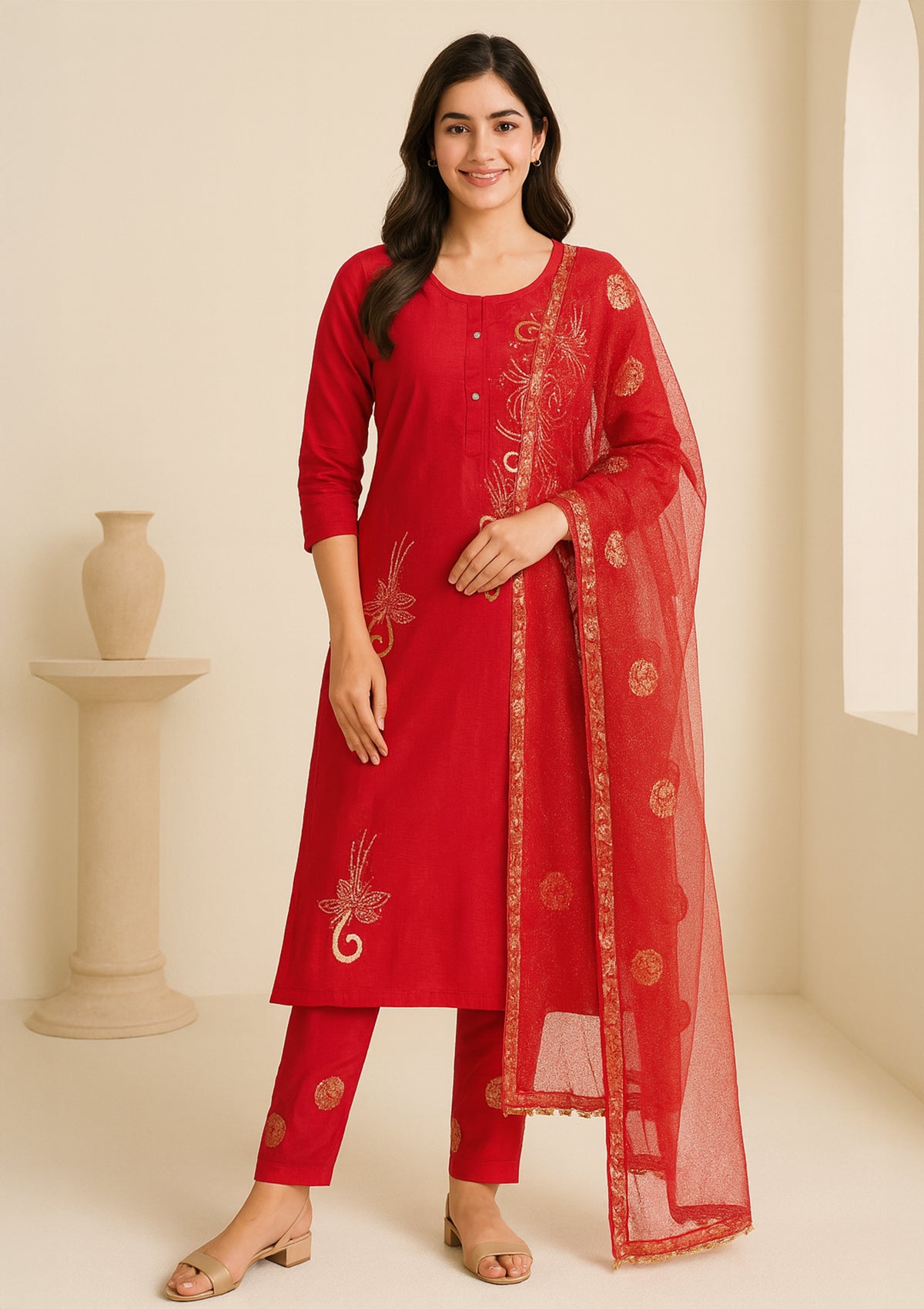 Stand out in every gathering with this striking, comfortable and trendy red jam cotton suit set—crafted for women who love elegance and ethnic grace.