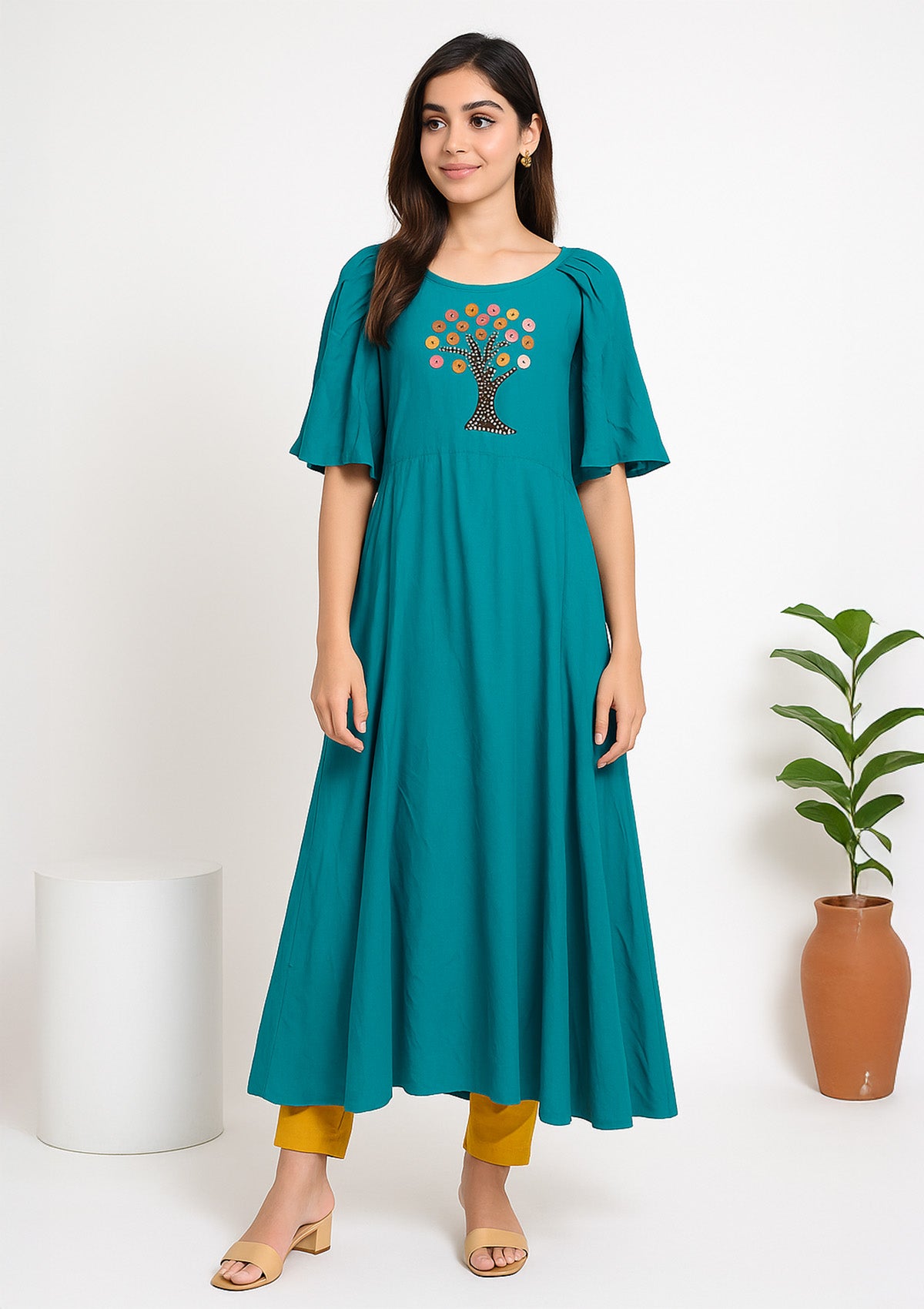 Women Rayon A-line Kurti – Teal Blue with Tree Motif