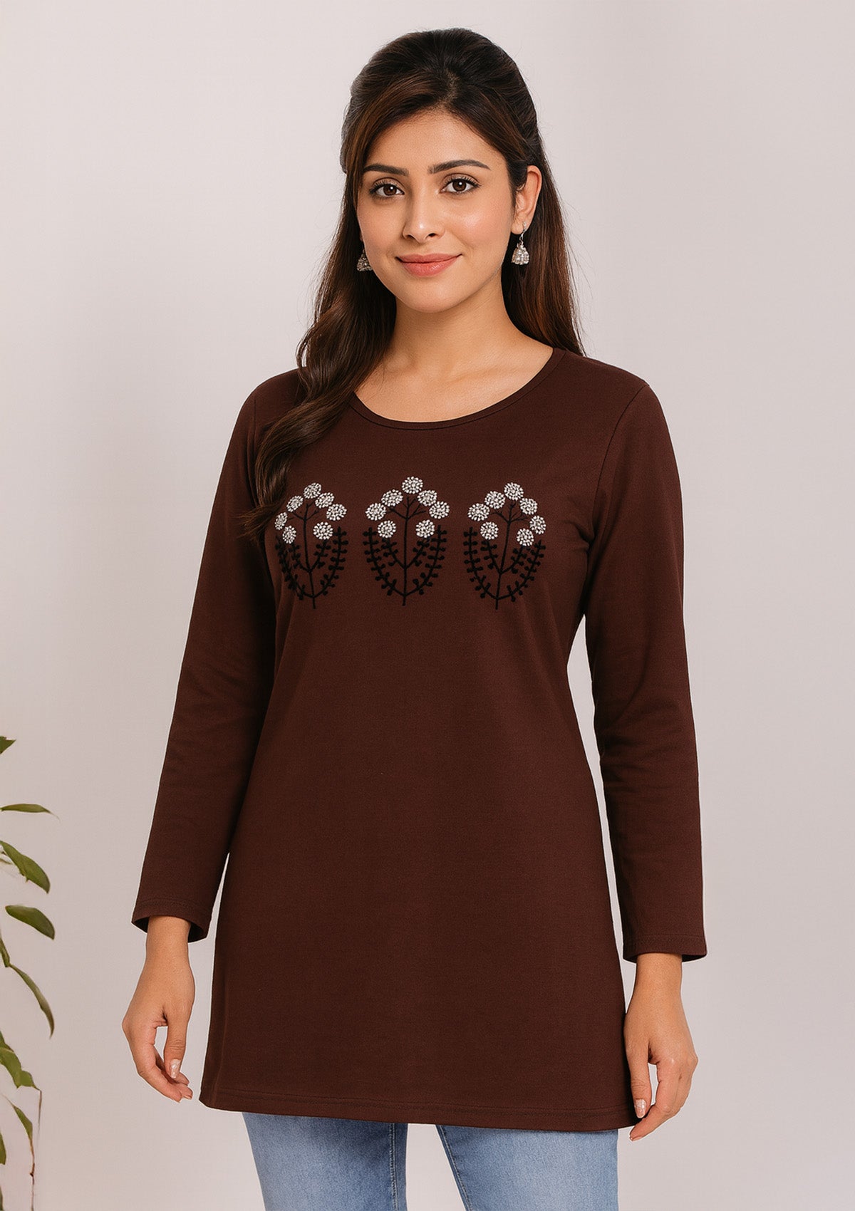 A coffee brown long top with a classic round neck, full sleeves, and a neat floral yoke placement in black and white for a clean, feminine look. The soft, breathable cotton‑blend knit offers gentle stretch and a mid‑thigh tunic silhouette that pairs perfectly with leggings or denim for everyday comfort.