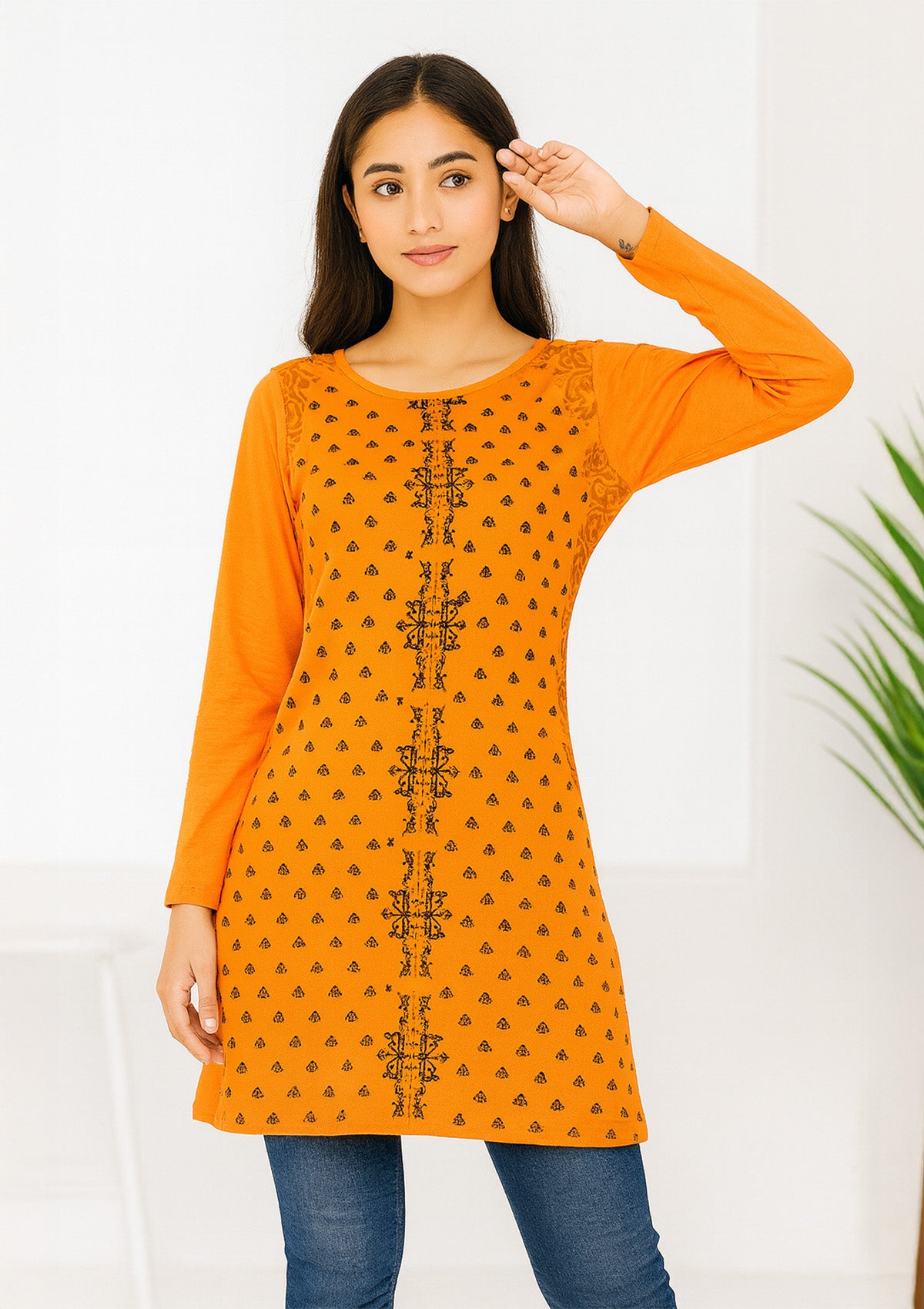 A mustard orange long top featuring a classic round neck, full sleeves, and a vertical motif stripe down the center with scattered paisley‑dot accents for an elongated, festive look. The soft, breathable cotton‑blend knit offers gentle stretch and a mid‑thigh tunic silhouette that pairs perfectly with leggings or denim for everyday comfort.