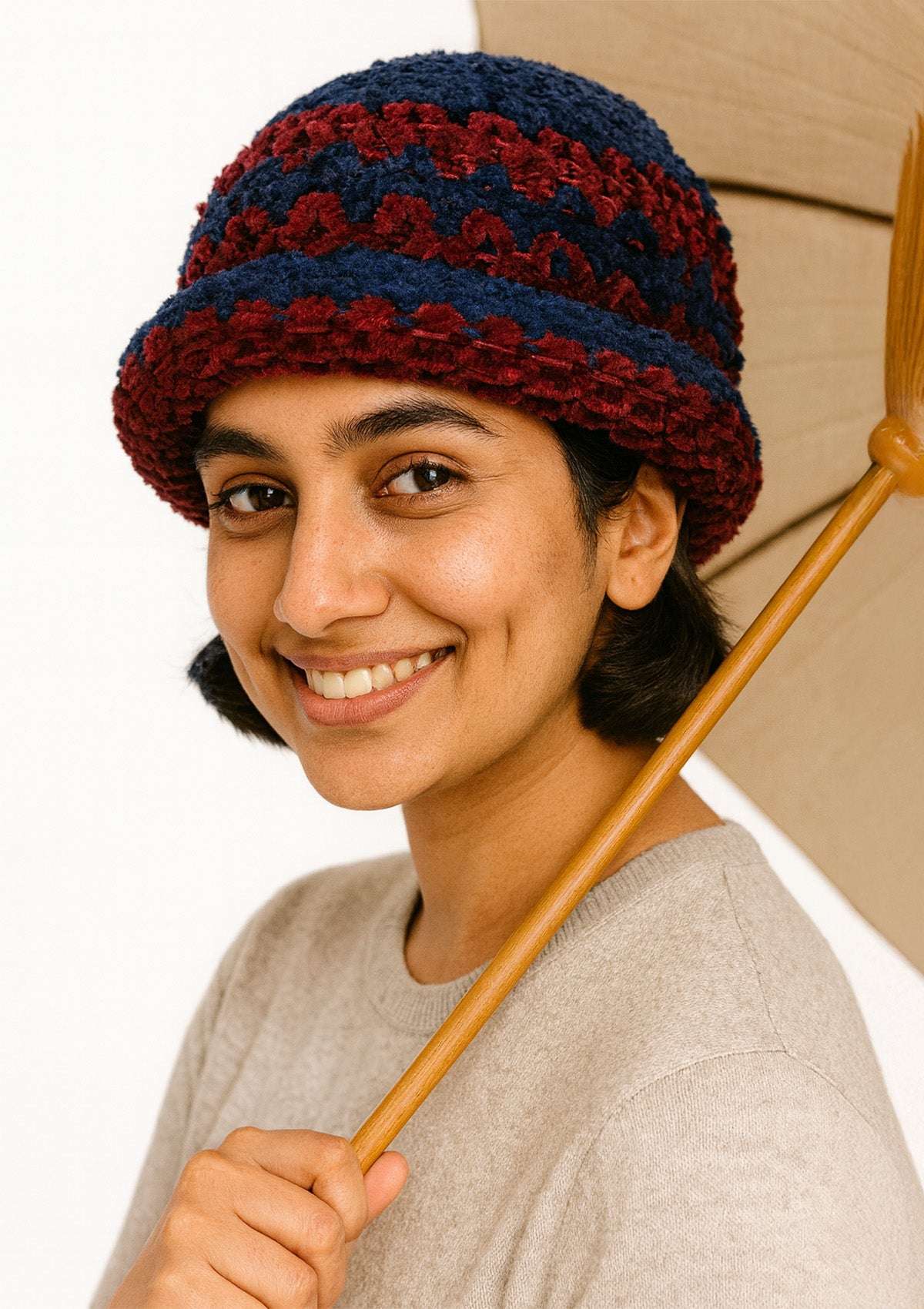 Maroon and navy blue chunky woolen cap for women, hand-knitted textured pattern