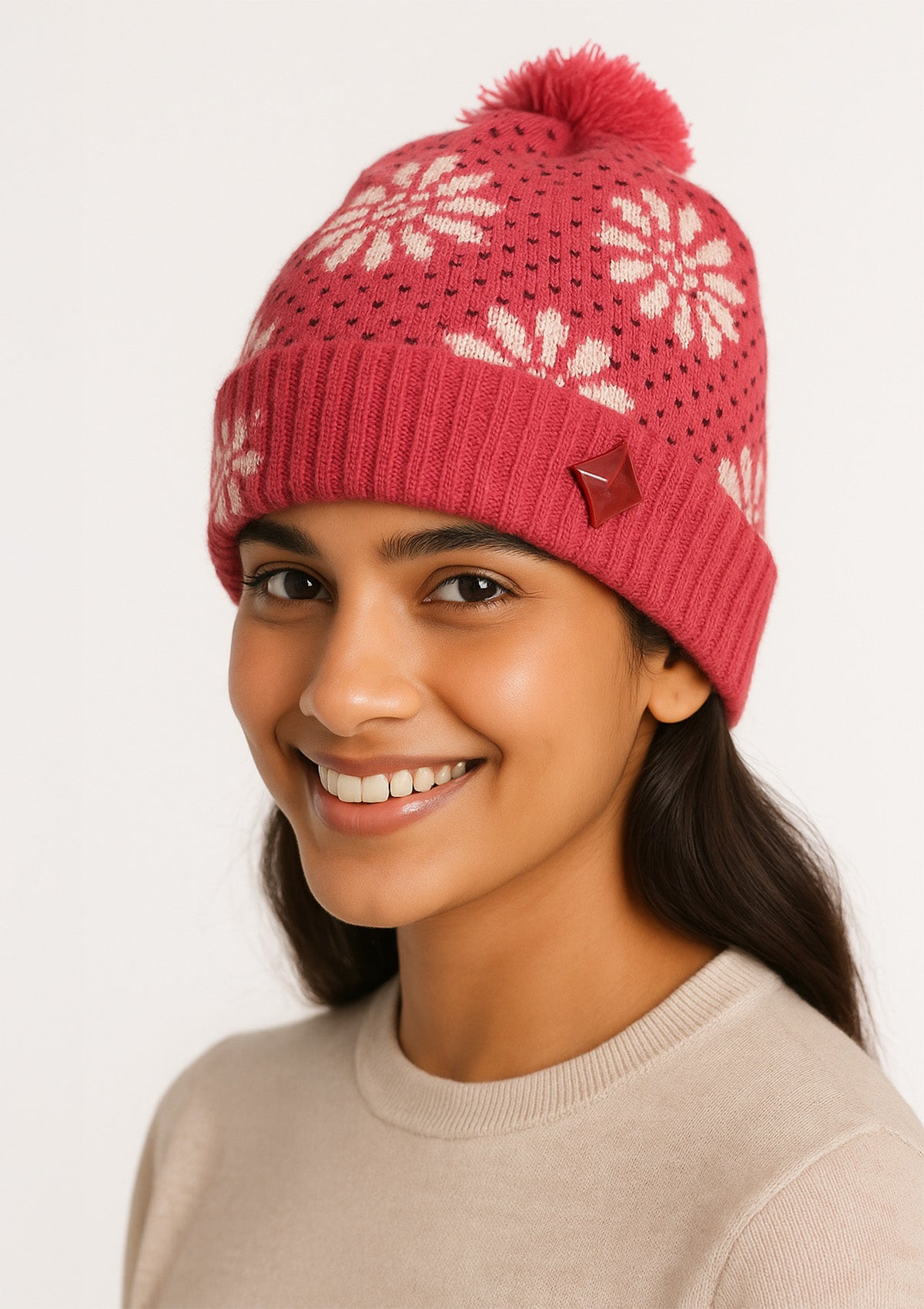 Add a touch of elegance and warmth to the winter wardrobe with this women’s pink woolen winter cap, beautifully adorned with a white floral knit pattern and striking diamond-shaped decorative button. Constructed from premium quality soft yarn, this beanie offers plush comfort, insulating warmth, and a gentle stretch fit for girls and ladies. The ribbed border and playful top fringe elevate the style, while black accent knit dots infuse a modern, trendy flair. Lightweight and easy to wash, this cap is the perfect companion for jackets, sweaters, and scarves—making it an ideal choice for school, college, gifting, and daily use all season long.