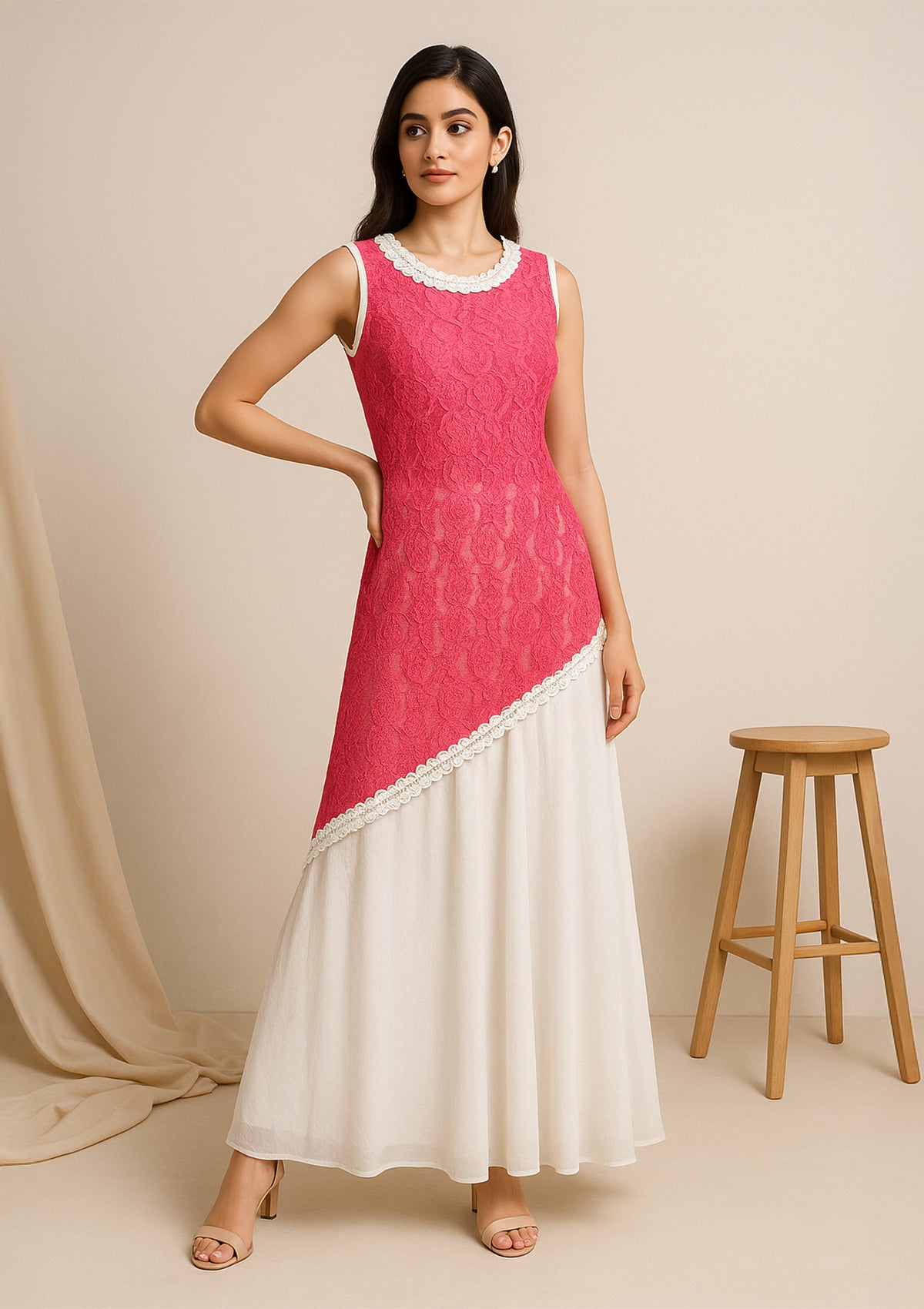 Shine bright in this women’s pink and white net midi dress, extra small size, designed with a charming asymmetric lace overlay, sleeveless cut, and intricate white floral embroidery at the neckline and hem. The breathable net fabric and elegant flow guarantee comfort and elegance for festive gatherings, family celebrations, or special occasions. Its modern silhouette and unique details give every event a graceful, feminine touch.