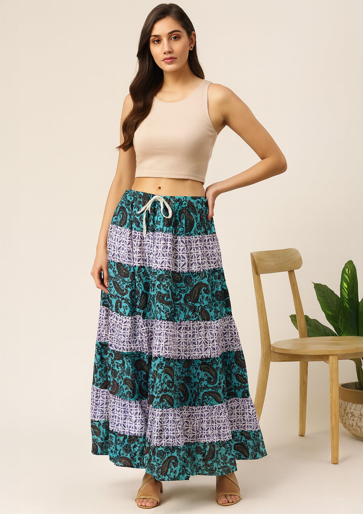 Bring out the bohemian spirit with this women’s teal green and white block print long skirt, crafted in soft cotton for XL comfort. Featuring alternating paisley motifs and lattice floral tiers, this flared maxi skirt boasts a breezy, adjustable drawstring waist for all-day wear. Perfect for summer outings, vacations, festive occasions, or casual ethnic looks, it pairs beautifully with tank tops, tees, or ethnic kurtis.