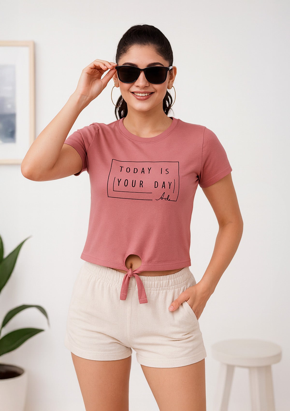 A dusty pink tie front crop top featuring a classic round neck, short sleeves, and a crisp framed “Today Is Your Day” text graphic for upbeat everyday style. The soft, breathable cotton jersey offers gentle stretch, while the adjustable front knot and waist‑skimming fit pair effortlessly with high‑rise jeans, shorts, or skirts for casual days and weekend outings.