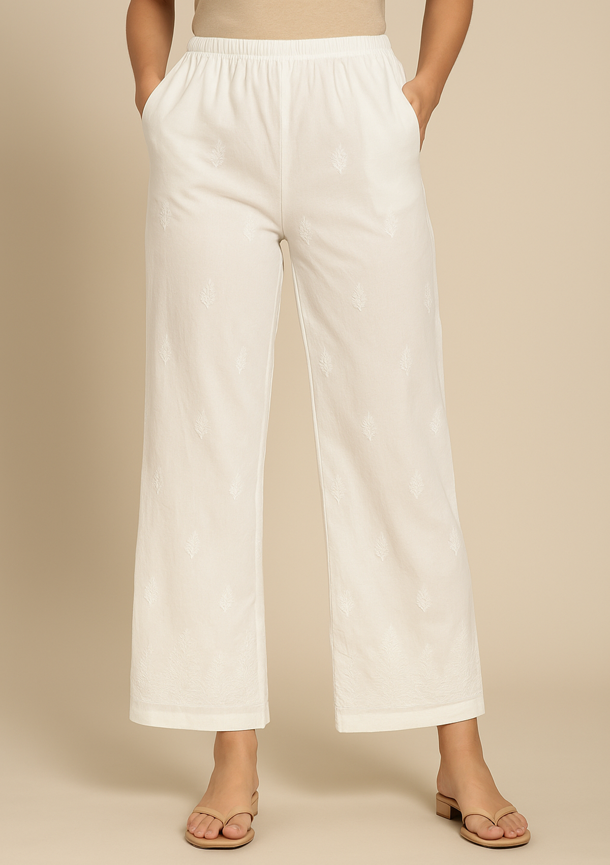 Refresh your ethnic wardrobe with these Women’s White Cotton Palazzo Pants, showcasing classic Lucknowi hand embroidery in elegant leafy motifs across the hem and leg. Made from soft, breathable cotton for all-day comfort, and tailored in a wide leg silhouette with an elastic drawstring waistband for easy fit. This super versatile white palazzo pairs effortlessly with kurtas, tunics, festive tops, or western silhouettes for daily use, parties, and special occasions.