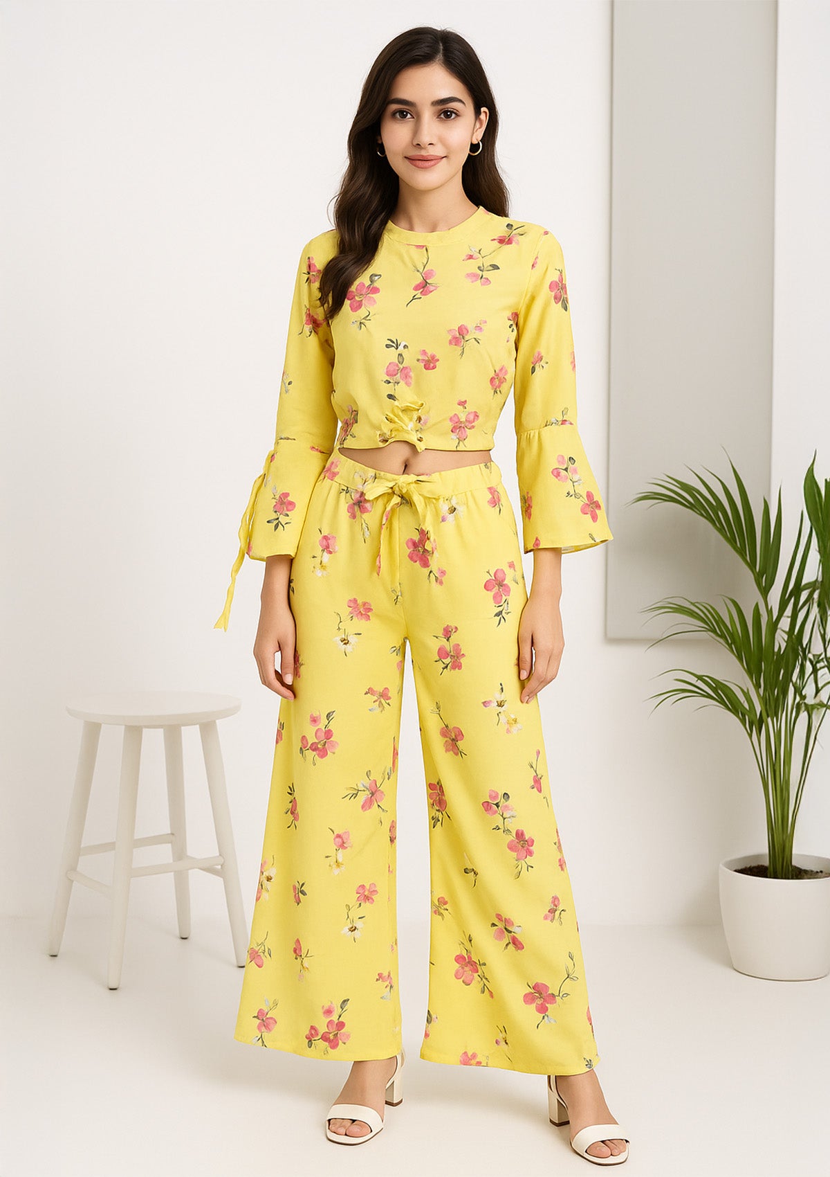 Women’s Yellow Floral Georgette Palazzo Co-ord Set