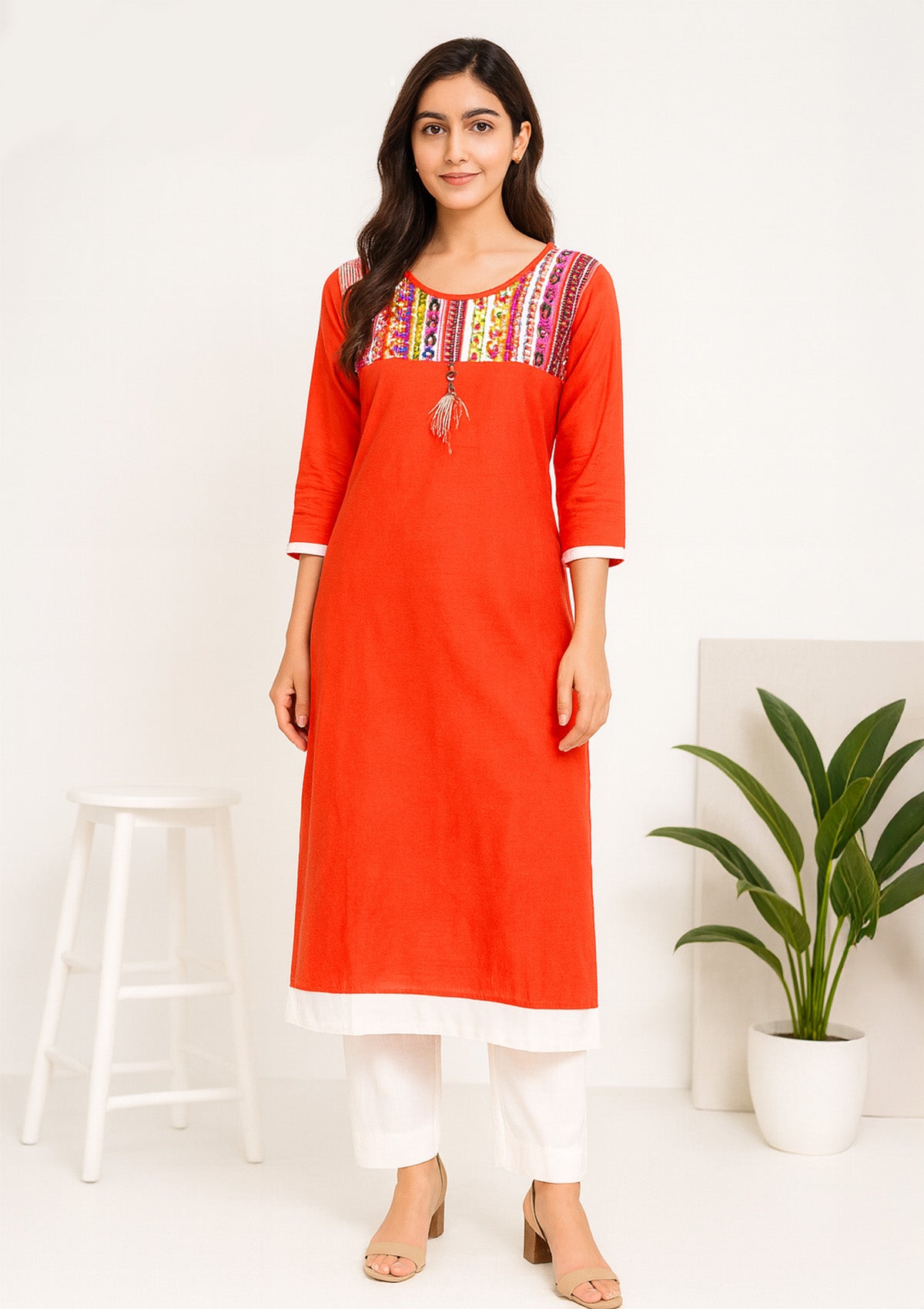 Bring effortless vibrance to your ethnic collection with this bright orange rayon straight kurti featuring an intricately embroidered multicolor yoke and eye-catching wooden button tassel accent. Tailored from soft, breathable rayon for all-day comfort, this kurti flaunts a straight silhouette with white contrast borders for a chic statement. Perfect for festive wear, casual outings, or daily office style—combining lively colors with a touch of boho artistry.